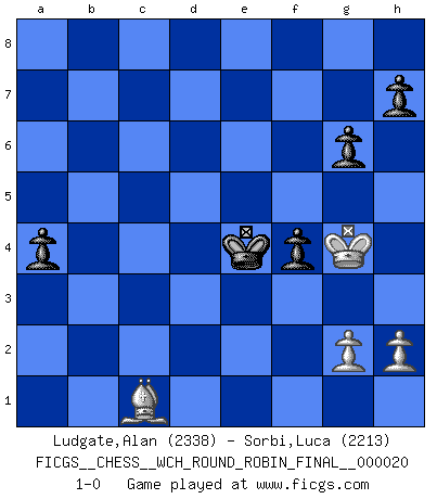 Last move : 1-0 2020 April 2 21:25:5 [Event "FICGS__CHESS__WCH_ROUND_ROBIN_FINAL__000020"] [Site "FICGS"] [Date "2020.03.02"] [Round "1"] [White "Ludgate,Alan"] [Black "Sorbi,Luca"] [Result "1-0"] [WhiteElo "2338"] [BlackElo "2213"] 1.d4 Nf6 2.c4 e6 3.Nc3 Bb4 4.f3 d5 5.a3 Bxc3+ 6.bxc3 c5 7.cxd5 Nxd5 8.dxc5 Qa5 9.e4 Ne7 10.Be3 O-O 11.Qb3 Qc7 12.Bb5 Nec6 13.Ne2 Na5 14.Qb4 e5 15.O-O Na6 16.Bxa6 bxa6 17.Rad1 Be6 18.Rd5 Rab8 19.Qa4 Bxd5 20.exd5 Rb5 21.d6 Qc6 22.Ng3 Rxc5 23.Qg4 Rc4 24.Nf5 Rxg4 25.Ne7+ Kh8 26.Nxc6 Ra4 27.Nxa5 Rxa5 28.c4 Rxa3 29.Bxa7 Rd3 30.c5 Kg8 31.Rb1 a5 32.Rb7 a4 33.Bb6 Ra8 34.c6 Rxd6 35.c7 Re6 36.Rb8+ Re8 37.Ba7 Raxb8 38.cxb8Q Rxb8 39.Bxb8 f6 40.Bd6 Kf7 41.Kf2 Ke6 42.Ba3 Kd5 43.Ke3 Kc4 44.f4 exf4+ 45.Kxf4 g6 46.Be7 f5 47.Kg5 Kd3 48.Kh6 f4 49.Kg5 Ke3 50.Bc5+ Ke4 51.Kg4 Kd5 52.Ba3 Ke4 53.Bc1 1-0 Nimzo-Indian : Kmoch variation Kingside Castling by player Black (move 10) Kingside Castling by player White (move 15) Promotion Queen by player White (move 38) 10 pieces endgame at move 44 : White KBPP , Black KPPPPP WHITE : King + 1 Bishop 2 Pawns BLACK : King + 5 Pawns 9 pieces endgame at move 45 : White KBPP , Black KPPPP WHITE : King + 1 Bishop 2 Pawns BLACK : King + 4 Pawns Player White won this chess game. Follow this game move after move (download)One bad move nullifies forty good ones. (Horowitz) Der beste Spieler in einem Turnier gewinnt es nie. Er landet auf Platz zwei oder drei. (Siegbert Tarrasch) Yo nunca en mi vida he jugado la Defensa Francesa, que viene siendo la más aburrida de todas las Aperturas. (Wilhelm Steinitz) On entre au jeu d'Echecs comme on entre en Religion. Pour le joueur d'Echecs, la partie d'Echecs c'est l'office, la messe, le défilé du 1er Mai, le dépôt de gerbe au Monument aux Morts. C'est un drame sacré. (Michel Roos) To err is human, to shift the blame on someone else is tactical. (Mladen Jankovic)