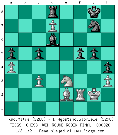 Last move : 1/2-1/2 2020 June 27 19:4:27 [Event "FICGS__CHESS__WCH_ROUND_ROBIN_FINAL__000020"] [Site "FICGS"] [Date "2020.03.02"] [Round "1"] [White "Tkac,Matus"] [Black "D Agostino,Gabriele"] [Result "1/2-1/2"] [WhiteElo "2260"] [BlackElo "2296"] 1.e4 c5 2.Nf3 d6 3.d4 cxd4 4.Nxd4 Nf6 5.Nc3 a6 6.f3 e5 7.Nb3 Be6 8.Be3 h5 9.Qd2 Nbd7 10.Nd5 Bxd5 11.exd5 g6 12.Be2 Bg7 13.O-O b6 14.c4 O-O 15.Rae1 Re8 16.Kh1 Rb8 17.Rd1 Nc5 18.Na1 b5 19.Nc2 bxc4 20.Nb4 Qa5 21.Nc6 Qxd2 22.Rxd2 c3 23.bxc3 Rb6 24.Bxc5 dxc5 25.Bc4 e4 26.a4 a5 27.Ra2 exf3 28.gxf3 Ra8 29.Rd1 Bf8 30.Bb5 Bd6 31.f4 Rb7 32.Kg2 h4 33.Kf3 Nh5 34.Ne5 Re7 35.Nc4 Bxf4 36.d6 Re6 37.Bd7 Rf6 38.Kg2 Rd8 39.Bg4 Ng7 40.Rf2 g5 41.h3 Rg6 42.d7 f5 43.Be2 Bc7 44.Ne3 Rd6 45.Rxd6 Bxd6 1/2-1/2 Sicilian : Najdorf Kingside Castling by player White (move 13) Kingside Castling by player Black (move 14) This chess game ended in a draw. Follow this game move after move (download)You sit at the board and suddenly your heart leaps. Your hand trembles to pick up the piece and move it. But what Chess teaches you is that you must sit there calmly and think about whether it's really a good idea and whether there are other better ideas. (Stanley Kubrick) Taktik ist was man tun muß, wenn etwas zu tun ist. Strategie ist was man tun muß, wenn nichts zu tun ist. (Savielly Grigorievitsch Tartakower) Yo he agregado estos principios a la ley: pongan los Caballos en acción antes de que los dos Alfiles sean desarrollados. (Emanuel Lasker) Les Echecs ne sont pas pour les âmes timides. Ils requièrent un homme entier, qui ne s'arrête pas aveuglément à ce qui a été déjà établi, mais qui tente individuellement de sonder les profondeurs du jeu. (W. Steinitz) The smarter you play, the luckier you'll be. (Mark Pilarski)