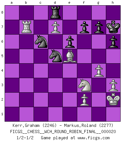 Last move : 1/2-1/2 2020 May 30 0:4:41 [Event "FICGS__CHESS__WCH_ROUND_ROBIN_FINAL__000020"] [Site "FICGS"] [Date "2020.03.02"] [Round "1"] [White "Kerr,Graham"] [Black "Markus,Roland"] [Result "1/2-1/2"] [WhiteElo "2246"] [BlackElo "2277"] 1.e4 c6 2.d4 d5 3.e5 c5 4.dxc5 e6 5.Nf3 Bxc5 6.a3 Ne7 7.b4 Bb6 8.Bb2 a5 9.Nbd2 axb4 10.axb4 Rxa1 11.Bxa1 Na6 12.Qb1 Bd7 13.c4 dxc4 14.b5 c3 15.Bxc3 Nd5 16.Ba1 Nac7 17.Bc4 Qa8 18.O-O Qa4 19.Ne4 O-O 20.Nd6 h6 21.h3 Bc5 22.Qd3 Bxd6 23.exd6 Bxb5 24.Bxb5 Nxb5 25.Be5 Na7 26.Ra1 Qb5 27.Qxb5 Nxb5 28.Rb1 Na7 29.Rxb7 Nc6 30.d7 Rd8 31.Kh2 Kh7 32.g4 1/2-1/2 Caro-Kann : Advance variation Kingside Castling by player White (move 18) Kingside Castling by player Black (move 19) This chess game ended in a draw. Follow this game move after move (download)My opponents make good moves too. Sometimes I don't take these things into consideration. (Bobby Fischer) Es ist im Leben wie im Schachspiel. Wir entwerfen einen Plan, dieser bleibt jedoch bedingt durch das, was im Schachspiel dem Gegner, im Leben dem Schicksal zu tun belieben wird. (Arthur Schopenhauer) Me dio la sensación de como si yo estuviera jugando en contra del mismo Ajedrez. - al estar jugando en contra de Robert Fischer (Walter Shipman) La vie est comme un jeu d'échecs : nous esquissons un plan, mais celui-ci est tributaire de ce que daignent faire l'adversaire aux échecs et le destin dans la vie. (Arthur Schopenhauer) To be champion requires more than simply being a strong player; one has to be a strong human being as well. (Anatoly Karpov)
