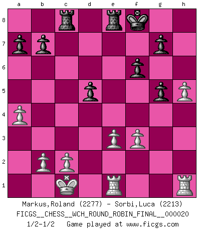 Last move : 1/2-1/2 2020 April 20 22:56:22 [Event "FICGS__CHESS__WCH_ROUND_ROBIN_FINAL__000020"] [Site "FICGS"] [Date "2020.03.02"] [Round "1"] [White "Markus,Roland"] [Black "Sorbi,Luca"] [Result "1/2-1/2"] [WhiteElo "2277"] [BlackElo "2213"] 1.e4 e5 2.Nf3 Nf6 3.Nxe5 d6 4.Nf3 Nxe4 5.Nc3 Nxc3 6.dxc3 Be7 7.Be3 O-O 8.Qd2 Nd7 9.O-O-O Ne5 10.h4 c6 11.Kb1 Qa5 12.a3 Rd8 13.h5 h6 14.Qe1 Nxf3 15.gxf3 Bf6 16.Bc4 Kf8 17.Bf4 Qc5 18.Bb3 Bf5 19.Qe3 Qxe3 20.fxe3 Be5 21.Rh4 Bf6 22.R4h1 d5 23.a4 Bg5 24.Bxg5 hxg5 25.Rdg1 f6 26.c4 Re8 27.Re1 Be6 28.cxd5 Bxd5 29.Bxd5 cxd5 30.Kc1 Rac8 1/2-1/2 Petrov : Nimzovich attack Kingside Castling by player Black (move 7) Queenside Castling by player White (move 9) This chess game ended in a draw. Follow this game move after move (download)Those who say they understand Chess, understand nothing. (Robert Hubner) Ich habe Kasparov in Rente geschickt. (Veselin Topalov) Vive, pierde y aprende al observar a tu oponente como gana. (Amber Steenbock) Roi des jeux et jeu des rois, les échecs portent en eux un sentiment d'infini. Ils donnent à celui qui s'est efforcé d'en approfondir les arcanes l'impression de n'être pas à la mesure de l'homme; en fait, ils constituent un résumé de l'univers, un microcosme, et figurent cette grande échelle qui, dans les plans de la lumière descend jusqu'à la matière, qui des abîmes insondables remonte jusqu'en l'infini de Dieu. (Pyrame) It is a good thing for an uneducated man to read books of quotations. (Winston Churchill)
