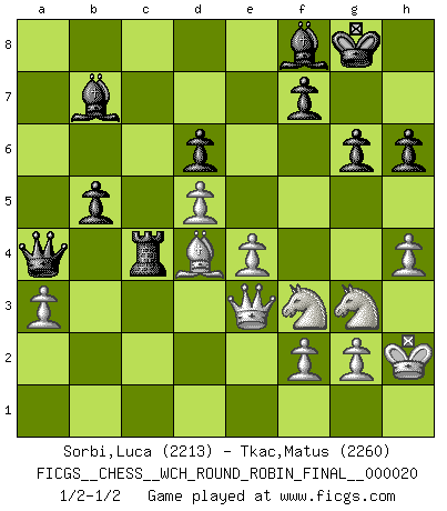 Last move : 1/2-1/2 2020 April 15 7:19:5 [Event "FICGS__CHESS__WCH_ROUND_ROBIN_FINAL__000020"] [Site "FICGS"] [Date "2020.03.02"] [Round "1"] [White "Sorbi,Luca"] [Black "Tkac,Matus"] [Result "1/2-1/2"] [WhiteElo "2213"] [BlackElo "2260"] 1.e4 e5 2.Nf3 Nc6 3.Bb5 a6 4.Ba4 Nf6 5.O-O Be7 6.Re1 b5 7.Bb3 d6 8.c3 O-O 9.h3 Bb7 10.d4 Re8 11.Nbd2 Bf8 12.a4 h6 13.Bc2 exd4 14.cxd4 Nb4 15.Bb1 c5 16.d5 Nd7 17.Ra3 c4 18.axb5 axb5 19.Nd4 Rxa3 20.bxa3 Nd3 21.Bxd3 cxd3 22.Re3 Nc5 23.Bb2 Qa5 24.Nf5 g6 25.Ng3 Be7 26.Nf3 Qa4 27.Rxd3 Nxd3 28.Qxd3 Rc8 29.Qe3 Rc2 30.Bd4 Rc4 31.h4 Bf8 32.Kh2 1/2-1/2 Ruy Lopez : Closed Kingside Castling by player White (move 5) Kingside Castling by player Black (move 8) This chess game ended in a draw. Follow this game move after move (download)After a bad opening, there is hope for the middle game. After a bad middle game, there is hope for the endgame. But once you are in the endgame, the moment of truth has arrived. (Edmar Mednis) Schach wird sich dank seiner hohen kulturellen Tradition immer durchsetzen. In näherer Zukunft womöglich sogar als Gegenreaktion auf die maßlose Reizüberflutung im Freizeit- und Spielbereich. (Garry Kasparov) a manera como él juega al Ajedrez, demuestra la completa naturaleza de un hombre. (Stanley Ellin) Les erreurs sont comme les malheurs, elles n'arrivent jamais seules. (Siegbert Tarrasch) Without deviation from the norm, progress is not possible. (Frank Zappa)