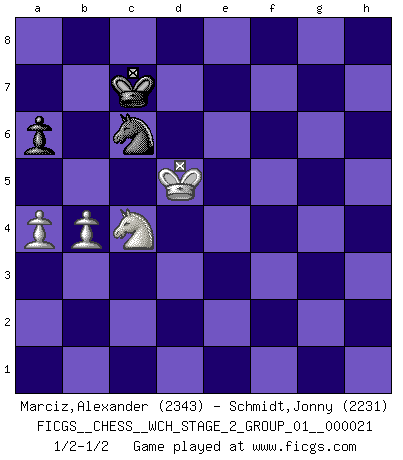 Last move : 1/2-1/2 2020 July 31 21:36:39 [Event "FICGS__CHESS__WCH_STAGE_2_GROUP_01__000021"] [Site "FICGS"] [Date "2020.03.02"] [Round "1"] [White "Marciz,Alexander"] [Black "Schmidt,Jonny"] [Result "1/2-1/2"] [WhiteElo "2343"] [BlackElo "2231"] 1.Nf3 c5 2.e4 d6 3.d4 Nf6 4.Nc3 cxd4 5.Nxd4 a6 6.Bg5 e6 7.f4 Nbd7 8.Qe2 Be7 9.O-O-O Qc7 10.g4 b5 11.Bg2 b4 12.e5 dxe5 13.fxe5 bxc3 14.Bxa8 Nxe5 15.Bf4 Bb7 16.Bxb7 Qxb7 17.b3 Ng6 18.Bg5 O-O 19.Kb1 Ne4 20.Bc1 Nd2+ 21.Bxd2 cxd2 22.Qxd2 h6 23.Rhf1 Bf6 24.h4 Bxh4 25.Nf3 Bf6 26.g5 hxg5 27.Nxg5 Rc8 28.Rfe1 Qc7 29.Ne4 Be7 30.c4 Rd8 31.Qe3 Rxd1+ 32.Rxd1 Qe5 33.Qd4 Qxd4 34.Rxd4 f5 35.Nd6 Ne5 36.c5 g5 37.Nc4 Nc6 38.Rd7 g4 39.Na5 Ne5 40.Rxe7 g3 41.Re8+ Kf7 42.Rd8 g2 43.Rd1 f4 44.c6 f3 45.c7 f2 46.c8Q f1Q 47.Qc7+ Kg6 48.Qd6 g1Q 49.Qxe6+ Kh7 50.Qe7+ Kg6 51.Qd6+ Kf7 52.Qd5+ Kf6 53.Rxf1+ Qxf1+ 54.Kb2 Nd3+ 55.Kc3 Nf4 56.Qd2 Ke6 57.Qe3+ Kf7 58.Kb2 Nd5 59.Qc5 Qe2+ 60.Ka3 Qb5 61.Qf2+ Ke6 62.Qe1+ Kd7 63.Qd2 Qc5+ 64.Kb2 Kc7 65.Nc4 Nb4 66.a3 Nd5 67.Qh2+ Kc6 68.Qh6+ Kc7 69.Kc2 Qf2+ 70.Kd3 Qf3+ 71.Kd4 Qf6+ 72.Qxf6 Nxf6 73.Ke5 Nd7+ 74.Kd5 Nf6+ 75.Ke6 Nd7 76.b4 Nf8+ 77.Kf7 Nh7 78.Kg7 Ng5 79.Kf6 Nf3 80.a4 Nd4 81.Ke5 Nc6+ 82.Kd5 1/2-1/2 Reti Opening Queenside Castling by player White (move 9) Kingside Castling by player Black (move 18) Promotion Queen by player White (move 46) Promotion Queen by player Black (move 46) Promotion Queen by player Black (move 48) 10 pieces endgame at move 53 : White KQRNPP , Black KQNP WHITE : King + 1 Queen 1 Rook 1 Knight 2 Pawns BLACK : King + 1 Queen 1 Knight 1 Pawn 9 pieces endgame at move 53 : White KQNPP , Black KQNP WHITE : King + 1 Queen 1 Knight 2 Pawns BLACK : King + 1 Queen 1 Knight 1 Pawn 8 pieces endgame at move 72 : White KQNPP , Black KNP WHITE : King + 1 Queen 1 Knight 2 Pawns BLACK : King + 1 Knight 1 Pawn 7 pieces endgame at move 72 : White KNPP , Black KNP WHITE : King + 1 Knight 2 Pawns BLACK : King + 1 Knight 1 Pawn This chess game ended in a draw. Follow this game move after move (download)Chess is played with the mind and not with the hands ! (Renaud and Kahn) Das Blackmar-Diemer-Gambit verändert den ganzen Menschen! (Emil Joseph Diemer) Yo siempre he tenido un ligero sentimiento de lástima por una persona que no tiene conocimiento del Ajedrez. (Siegbert Tarrasch) Des points faibles ou des trous dans la position de l'adversaire doivent être occupés par des pièces et non pas par des pions. (Siegbert Tarrasch) Memory is a way of holding onto the things you love, the things you are, the things you never want to lose. (from the television show: The Wonder Years)