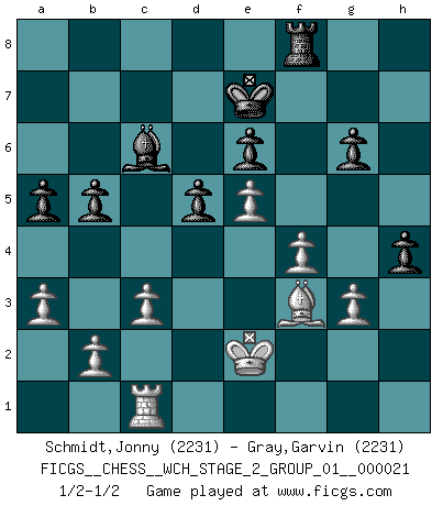 Last move : 1/2-1/2 2020 July 8 15:38:13 [Event "FICGS__CHESS__WCH_STAGE_2_GROUP_01__000021"] [Site "FICGS"] [Date "2020.03.02"] [Round "1"] [White "Schmidt,Jonny"] [Black "Gray,Garvin"] [Result "1/2-1/2"] [WhiteElo "2231"] [BlackElo "2231"] 1.e4 c5 2.Nc3 e6 3.Nf3 a6 4.g3 b5 5.Bg2 Bb7 6.d4 cxd4 7.Nxd4 Nf6 8.a3 Qc7 9.O-O Nc6 10.Nxc6 dxc6 11.Qe2 Be7 12.e5 Nd5 13.Nxd5 cxd5 14.c3 O-O 15.h4 a5 16.Bd2 Rfd8 17.h5 h6 18.Rfd1 Bc5 19.Rac1 Ba7 20.Bf1 Qc5 21.Bg2 Qc4 22.Bf1 Qc5 23.Bg2 Qc4 24.Bf1 Bc6 25.Bf4 Qxe2 26.Bxe2 Rab8 27.Kf1 Rf8 28.Rd3 g5 29.hxg6 fxg6 30.Be3 Bxe3 31.Rxe3 Kg7 32.Rf3 Rxf3 33.Bxf3 Rf8 34.Bg4 Kf7 35.f4 h5 36.Bf3 Ke7 37.Ke2 h4 1/2-1/2 Sicilian : Closed Kingside Castling by player White (move 9) Kingside Castling by player Black (move 14) This chess game ended in a draw. Follow this game move after move (download)Pawns: they are the soul of this game, they alone form the attack and defense. (Philidor) Wenn Schach ein enormer Dschungel ist, der seine Myriaden von Geheimnissen nicht preisgeben will, dann sind Computer die Kettensägen einer gewaltigen ökologisch unsensiblen Nutzholzfirma. (Nigel Short) Yo nunca en mi vida he jugado la Defensa Francesa, que viene siendo la más aburrida de todas las Aperturas. (Wilhelm Steinitz) Les Echecs représentent une sphère d'idées créatrices basée sur la volonté des deux protagonistes. (Smyslov) Hold em is to stud what chess is to checkers. (Johnny Moss)