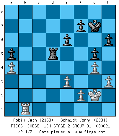 Last move : 1/2-1/2 2020 May 14 8:16:43 [Event "FICGS__CHESS__WCH_STAGE_2_GROUP_01__000021"] [Site "FICGS"] [Date "2020.03.02"] [Round "1"] [White "Robin,Jean"] [Black "Schmidt,Jonny"] [Result "1/2-1/2"] [WhiteElo "2158"] [BlackElo "2231"] 1.d4 d5 2.c4 e6 3.Nf3 Nf6 4.g3 dxc4 5.Bg2 Nc6 6.Qa4 Bb4+ 7.Bd2 Nd5 8.Qc2 Nb6 9.Bxb4 Nxb4 10.Qc3 N4d5 11.Qa5 Bd7 12.O-O O-O 13.Na3 Bc6 14.Ne5 Ne7 15.Nxc6 Nxc6 16.Bxc6 bxc6 17.Qc3 Rb8 18.Rab1 Qd5 19.Rfc1 Rfd8 20.Nxc4 Nxc4 21.Qxc4 Qxd4 22.Qxc6 Rxb2 23.e3 Qb6 24.Rxb2 Qxb2 25.Qxc7 Qd2 26.Rb1 a5 27.a4 h6 28.h3 Rd7 29.Qc4 g5 30.Kg2 Qd5+ 31.Qxd5 Rxd5 32.g4 Kg7 1/2-1/2 Queen's gambit declined Kingside Castling by player White (move 12) Kingside Castling by player Black (move 12) This chess game ended in a draw. Follow this game move after move (download)Personally, I rather look forward to a computer program winning the world Chess Championship. Humanity needs a lesson in humility. (Richard Dawkings) Im Internet Chess Club betrug mein Rating vorübergehend 3350 ELO-Punkte. (Sergej Karjakin) El pensamiento metódico es mas útil en el Ajedrez que la inspiración. (C. J. S. Purdy) Lorsque vous vous retrouvez devant une position atroce, ne tendez pas un ultime piège dérisoire avec l'intention d'abandonner si l'adversaire le déjoue ! Faites-vous plutôt un devoir de résister comme si votre vie en dépendait. Jouez le coup qui vous déplairait au centuple si vous étiez dans la peau de votre tortionnaire ! Luck is what you have left over after you give 100 percent. (Langston Coleman)