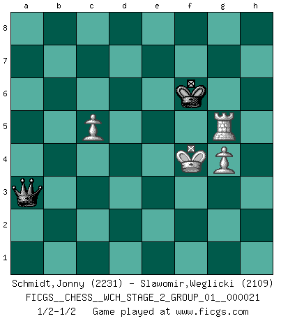 Last move : 1/2-1/2 2020 May 21 21:52:43 [Event "FICGS__CHESS__WCH_STAGE_2_GROUP_01__000021"] [Site "FICGS"] [Date "2020.03.02"] [Round "1"] [White "Schmidt,Jonny"] [Black "Slawomir,Weglicki"] [Result "1/2-1/2"] [WhiteElo "2231"] [BlackElo "2109"] 1.e4 c5 2.Nc3 Nc6 3.Nf3 g6 4.Bb5 Bg7 5.O-O e5 6.a3 Nge7 7.b4 d6 8.Bc4 O-O 9.d3 cxb4 10.axb4 Nxb4 11.Ba3 Nec6 12.Qd2 a6 13.Ng5 Qe7 14.Bb3 Rb8 15.Ne2 a5 16.c3 Na6 17.f4 Nc5 18.Bxc5 dxc5 19.f5 Bh6 20.h4 b5 21.Bd5 gxf5 22.Bxc6 f6 23.Rxa5 fxg5 24.exf5 Qf6 25.Qe3 Qxc6 26.hxg5 Bb7 27.Rf2 Bg7 28.f6 Bxf6 29.gxf6 Rxf6 30.Qxe5 Rbf8 31.Qg3+ Rg6 32.Rxf8+ Kxf8 33.Qf2+ Kg8 34.Nf4 Rg4 35.Ra7 c4 36.d4 Qe4 37.d5 Bxd5 38.Rd7 Rxf4 39.Qg3+ Qg6 40.Qxg6+ hxg6 41.Rxd5 Rf5 42.Rd7 Kf8 43.Rb7 Ke8 44.Rg7 g5 45.g4 Rc5 46.Kf2 b4 47.cxb4 c3 48.bxc5 c2 49.Rxg5 c1Q 50.Re5+ Kf7 51.Rf5+ Kg6 52.Kf3 Qb1 53.Ke3 Qb3+ 54.Kf4 Qa3 55.Rg5+ Kf6 1/2-1/2 Sicilian : Closed, 2...Nc6 Kingside Castling by player White (move 5) Kingside Castling by player Black (move 8) 10 pieces endgame at move 40 : White KRPP , Black KRBPPP WHITE : King + 1 Rook 2 Pawns BLACK : King + 1 Rook 1 Bishop 3 Pawns 9 pieces endgame at move 41 : White KRPP , Black KRPPP WHITE : King + 1 Rook 2 Pawns BLACK : King + 1 Rook 3 Pawns 8 pieces endgame at move 47 : White KRPP , Black KRPP WHITE : King + 1 Rook 2 Pawns BLACK : King + 1 Rook 2 Pawns 7 pieces endgame at move 48 : White KRPP , Black KPP WHITE : King + 1 Rook 2 Pawns BLACK : King + 2 Pawns 6 pieces endgame at move 49 : White KRPP , Black KP WHITE : King + 1 Rook 2 Pawns BLACK : King + 1 Pawn Promotion Queen by player Black (move 49) This chess game ended in a draw. Follow this game move after move (download)Chess is not like life... it has rules ! (Mark Pasternak) Man wirke der falschen Auffassung entgegen, als ob jeder Zug Unmittelbares zu leisten habe; auch Werte- und Ruhezüge haben ihre Existenzberechtigung. (Aaron Nimzowitsch) El Ajedrez es sobre todo, ¡una pelea!. (Emanuel Lasker) Psychologiquement, tu dois avoir confiance en toi même, mais cette confiance doit être basée sur des faits. (Robert Fischer) Kids, you tried your best and you failed miserably. The lesson is, never try. (Simpsons)