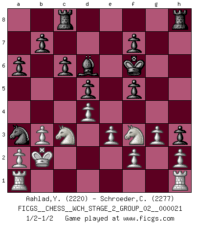 Last move : 1/2-1/2 2020 March 17 0:56:13 [Event "FICGS__CHESS__WCH_STAGE_2_GROUP_02__000021"] [Site "FICGS"] [Date "2020.03.02"] [Round "1"] [White "Aahlad,Yeturu"] [Black "Schroeder,Christoph"] [Result "1/2-1/2"] [WhiteElo "2220"] [BlackElo "2277"] 1.d4 d5 2.c4 e6 3.Nc3 Nf6 4.cxd5 exd5 5.Bg5 c6 6.e3 Bf5 7.Qf3 Bg6 8.Bxf6 Qxf6 9.Qxf6 gxf6 10.Kd2 Nd7 11.g3 Nb6 12.Nh3 h5 13.Nf4 h4 14.Bd3 Bxd3 15.Kxd3 f5 16.Rag1 Nc4 17.Kc2 Bd6 18.b3 Na3+ 19.Kb2 Ke7 20.Ng2 h3 21.Nh4 Kf6 22.Nf3 a6 23.Ra1 Rac8 1/2-1/2 QGD : Exchange, positional line, 5...c6 This chess game ended in a draw. Follow this game move after move (download)Even the laziest King flees wildly in the face of a double check ! (Aaron Nimzowitsch) Strategie ist, wie man ein Mädchen auf den Rücksitz bekommt. Taktik ist, was man tut, wenn man dann dort ist. (Anonymous) Uno no tiene que jugar muy bien, es suficiente jugar mejor que el oponente. (Siegbert Tarrasch) Les Echecs ne sont pas pour les âmes timides. Ils requièrent un homme entier, qui ne s'arrête pas aveuglément à ce qui a été déjà établi, mais qui tente individuellement de sonder les profondeurs du jeu. (W. Steinitz) Chess is as much a mystery as women. (Purdy)