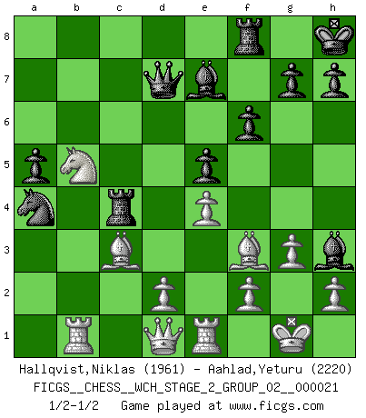 Last move : 1/2-1/2 2020 March 28 23:45:48 [Event "FICGS__CHESS__WCH_STAGE_2_GROUP_02__000021"] [Site "FICGS"] [Date "2020.03.02"] [Round "1"] [White "Hallqvist,Niklas"] [Black "Aahlad,Yeturu"] [Result "1/2-1/2"] [WhiteElo "1961"] [BlackElo "2220"] 1.c4 e5 2.g3 Nf6 3.Bg2 d5 4.cxd5 Nxd5 5.Nf3 Nc6 6.O-O Nb6 7.Nc3 Be7 8.a3 O-O 9.b4 Be6 10.b5 Nd4 11.Rb1 f6 12.e3 Nxf3+ 13.Bxf3 c6 14.bxc6 bxc6 15.Bxc6 Rc8 16.Bf3 Kh8 17.a4 a5 18.Nb5 Bf5 19.e4 Bh3 20.Re1 Qd7 21.Bb2 Rc4 22.Bc3 Nxa4 1/2-1/2 English Opening Kingside Castling by player White (move 6) Kingside Castling by player Black (move 8) This chess game ended in a draw. Follow this game move after move (download)All Chess players should have a hobby. (Savielly Tartakower) Wenn Du einsam bist, wenn Du Dich in der Welt wie ein Fremder fühlst, spiele Schach. Das wird Deinen Geist erheben und Dein Ratgeber im Kampf sein. (Aristoteles) La pasion por jugar al Ajedrez es una de las mas inexplicables en el mundo. (H.G. Wells) On peut tirer plus d'utilité d'une partie perdue que de 100 parties gagnées. (Capablanca) Creativity is inventing, experimenting, growing, taking risks, breaking rules, making mistakes, and having fun. (Mary Lou Cook)