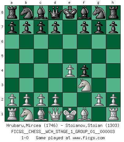 Last move : 1-0 2007 August 18 4:18:23 [Event "FICGS__CHESS__WCH_STAGE_1_GROUP_01__000003"] [Site "FICGS"] [Date "2007.07.11"] [Round "1"] [White "Hrubaru,Mircea"] [Black "Stoianov,Stoian"] [Result "1-0"] [WhiteElo "1746"] [BlackElo "1303"] 1.e4 e5 2.f4 exf4 3.Nf3 1-0 This chess game has been lost on time (started : 2007.07.11 16:47:33) King's knight's gambit Player White won this chess game. Follow this game move after move (download)The game of Chess is not merely an idle amusement; several very valuable qualities of the mind are to be acquired and strengthened by it, so as to become habits ready on all occasions; for life is a kind of Chess. (Benjamin Franklin) Ich habe Kasparov in Rente geschickt. (Veselin Topalov) Dios mío, Bobby Fischer juega tan simple. (Alexei Suetin) Il (Jacob Murray) ne joue pas pour le bon coup, mais pour le meilleur. (Eloi Relange) Players are not good because they find tactics, it is about the way to find the positions in which those tactics are hidden. (Luc-Olivier Leclerc)