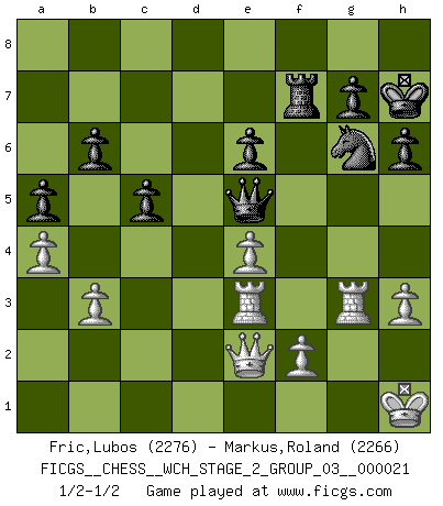 Last move : 1/2-1/2 2020 May 15 19:23:25 [Event "FICGS__CHESS__WCH_STAGE_2_GROUP_03__000021"] [Site "FICGS"] [Date "2020.03.02"] [Round "1"] [White "Fric,Lubos"] [Black "Markus,Roland"] [Result "1/2-1/2"] [WhiteElo "2276"] [BlackElo "2266"] 1.e4 e5 2.Nf3 Nc6 3.Bc4 Bc5 4.c3 Nf6 5.d3 d6 6.O-O O-O 7.h3 a5 8.Re1 h6 9.a4 Ba7 10.Nbd2 Be6 11.Bxe6 fxe6 12.Nf1 d5 13.Ng3 d4 14.cxd4 Bxd4 15.Rb1 Bb6 16.Qb3 Qe7 17.Be3 Nd7 18.Bxb6 Nxb6 19.Ne2 Rxf3 20.gxf3 Rf8 21.d4 Nxd4 22.Nxd4 exd4 23.Rbd1 Nd7 24.Rxd4 Ne5 25.Re3 Kh7 26.Rd1 Qf6 27.Kg2 b6 28.Qc2 Qg5+ 29.Kh1 Qh4 30.Kg2 Rf7 31.Rg1 c5 32.f4 Qxf4 33.Qe2 Qf6 34.b3 Ng6 35.Kh1 Nh4 36.R1g3 Qe5 37.Kg1 Ng6 38.Kh1 1/2-1/2 Giuoco Piano Kingside Castling by player White (move 6) Kingside Castling by player Black (move 6) This chess game ended in a draw. Follow this game move after move (download)In a gambit you give up a Pawn for the sake of getting a lost game. (Samuel Standige Boden) Es ist wirklich schade, dass so viele Schachspieler nicht auf ihr Äußeres achten! (Alexandra Kosteniuk) El Ajedrez es una manera fabulosa para que los niños aprendan a autovalorarse y a autoestimarse. (Saudin Robovic) Aux échecs, les retours au sommet sont rares : les dommages psychologiques consécutifs à une défaite sont trop sévères. (Daily Telegraph) See no evil, hear no evil, speak no evil. (The 3 monkeys)