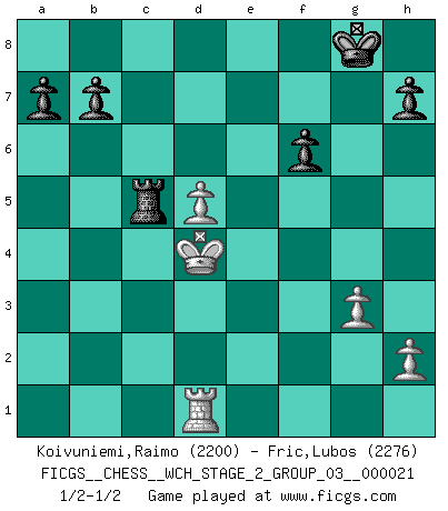Last move : 1/2-1/2 2020 June 26 16:30:6 [Event "FICGS__CHESS__WCH_STAGE_2_GROUP_03__000021"] [Site "FICGS"] [Date "2020.03.02"] [Round "1"] [White "Koivuniemi,Raimo"] [Black "Fric,Lubos"] [Result "1/2-1/2"] [WhiteElo "2200"] [BlackElo "2276"] 1.d4 Nf6 2.c4 e6 3.Nc3 Bb4 4.Qc2 O-O 5.e4 d5 6.e5 Ne4 7.Bd3 c5 8.Nge2 cxd4 9.Nxd4 Nd7 10.Bf4 Qh4 11.g3 Qh5 12.Be2 Qg6 13.a3 Bc5 14.Rd1 f6 15.Nxe4 dxe4 16.Nxe6 Bxf2+ 17.Kd2 Re8 18.Nc7 fxe5 19.Nxe8 exf4 20.Nc7 Qd6+ 21.Nd5 f3 22.Qxe4 fxe2 23.Kxe2 Bc5 24.b4 Nf6 25.bxc5 Bg4+ 26.Kd3 Qd8 27.Qd4 Bxd1 28.Rxd1 Qa5 29.Kc2 Qxa3 30.Ra1 Qf3 31.Re1 Rf8 32.Nxf6+ gxf6 33.Qd5+ Qxd5 34.cxd5 Rd8 35.Rd1 Rc8 36.Kd3 Rxc5 37.Kd4 1/2-1/2 Nimzo-Indian : Classical variation Kingside Castling by player Black (move 4) This chess game ended in a draw. Follow this game move after move (download)I prefer to lose a really good game than to win a bad one. (David Levy) Moralische Siege zählen nicht. (Savielly Grigorievitsch Tartakower) El Ajedrez es sobre todo, ¡una pelea!. (Emanuel Lasker) Un journaliste : 'Vous préférez avoir une dame de plus sur l'échiquier ou au lit ?' Boris Spassky : 'Ca dépend de la position.' All the troubles of the world come from being unable to sit alone in a quiet room. (Blaise Pascal)