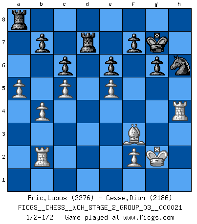 Last move : 1/2-1/2 2020 June 11 9:22:17 [Event "FICGS__CHESS__WCH_STAGE_2_GROUP_03__000021"] [Site "FICGS"] [Date "2020.03.02"] [Round "1"] [White "Fric,Lubos"] [Black "Cease,Dion"] [Result "1/2-1/2"] [WhiteElo "2276"] [BlackElo "2186"] 1.Nf3 d5 2.g3 g6 3.Bg2 Bg7 4.d4 Nf6 5.c4 c6 6.O-O dxc4 7.a4 Ne4 8.Qc2 Nd6 9.e4 Na6 10.Na3 Nb4 11.Qc3 a5 12.e5 Nf5 13.Nxc4 h5 14.Bg5 Be6 15.h3 O-O 16.Rfe1 Qc7 17.Bd2 Rfd8 18.g4 hxg4 19.hxg4 Nh6 20.Nxa5 Qxa5 21.Qxb4 Qxb4 22.Bxb4 Bxg4 23.Bc5 Nf5 24.Re4 Bxf3 25.Bxf3 e6 26.Bb6 Rd7 27.a5 Bf8 28.Rg4 Kg7 29.Rb1 Ne7 30.b4 Nc8 31.Bc5 Bxc5 32.dxc5 Ne7 33.Kg2 Nf5 34.Rb2 Nh6 35.Rh4 1/2-1/2 Reti : King's Indian attack Kingside Castling by player White (move 6) Kingside Castling by player Black (move 15) This chess game ended in a draw. Follow this game move after move (download)If your opponent cannot do anything active, then don't rush the position; instead you should let him sit there, suffer, and beg you for a draw. (Jeremy Silman) Ich bin der einzige Schachspieler, der sich während der Vorbereitungen zum Turnier verletzt hat. (Woody Allen) Preferería tener un Peón que un dedo. (Reuben Fine) La tactique, c'est ce que vous faites quand il y a quelque chose à faire; la stratégie, c'est ce que vous faites quand il n'y a rien à faire. (Savielli Tartacower) Games, world of games... There's always an opponent, and there's always a victim. (Revolver, movie)