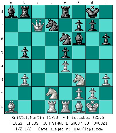 Last move : 1/2-1/2 2020 May 22 9:15:57 [Event "FICGS__CHESS__WCH_STAGE_2_GROUP_03__000021"] [Site "FICGS"] [Date "2020.03.02"] [Round "1"] [White "Knittel,Martin"] [Black "Fric,Lubos"] [Result "1/2-1/2"] [WhiteElo "1798"] [BlackElo "2276"] 1.e4 e5 2.Nf3 Nc6 3.Bb5 a6 4.Ba4 Nf6 5.O-O Be7 6.Re1 b5 7.Bb3 d6 8.c3 O-O 9.h3 Re8 10.d4 Bb7 11.Nbd2 Bf8 12.Bc2 h6 13.a3 Nb8 14.b3 Nbd7 15.Bb2 c6 16.Bd3 Nh5 17.Bf1 Nf4 18.Qc2 Rc8 19.Rad1 Qc7 20.c4 Ne6 21.Qd3 Rb8 22.Qc2 Ba8 23.Ba1 Be7 24.cxb5 axb5 25.a4 Bf6 26.dxe5 dxe5 27.axb5 cxb5 28.Qxc7 1/2-1/2 Ruy Lopez : Closed Kingside Castling by player White (move 5) Kingside Castling by player Black (move 8) This chess game ended in a draw. Follow this game move after move (download)When you don't know what to play, wait for an idea to come into your opponent's mind. You may be sure that idea will be wrong. (Siegbert Tarrasch) Ich weiss nicht was Gott gegen mich auf 1.e4 antworten würde. (Robert James Fischer) Solo existe una cosa que Fischer hace en el Ajedrez sin placer: ¡perder!. (Boris Spassky) Il n'y a pas de prix trop élevé au scalp de l'ennemi. (Koblentz) I'm extremely disappointed. I send you out for exciting, new designer drugs, you come back with tomato sauce. (Gregory House, House M.D.)
