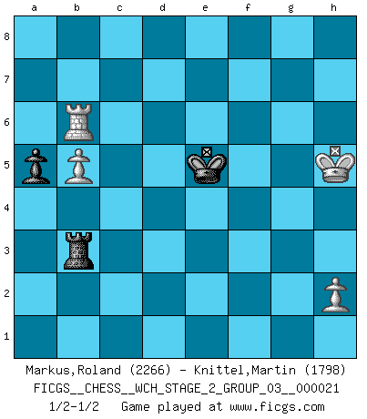 Last move : 1/2-1/2 2020 June 10 20:0:37 [Event "FICGS__CHESS__WCH_STAGE_2_GROUP_03__000021"] [Site "FICGS"] [Date "2020.03.02"] [Round "1"] [White "Markus,Roland"] [Black "Knittel,Martin"] [Result "1/2-1/2"] [WhiteElo "2266"] [BlackElo "1798"] 1.Nf3 d5 2.d4 Nf6 3.e3 c5 4.c3 e6 5.Nbd2 Nbd7 6.Bd3 b6 7.O-O Bb7 8.Qe2 Ne4 9.c4 Bd6 10.cxd5 exd5 11.b3 O-O 12.Bb2 Qe8 13.a4 a6 14.Rac1 Qe7 15.Rfd1 f5 16.g3 Rf7 17.Rf1 a5 18.Rcd1 Nf8 19.Nb1 Ne6 20.dxc5 N6xc5 21.Nc3 Rc8 22.Nd4 Nxd3 23.Qxd3 Nc5 24.Qb1 Qf6 25.Nce2 g5 26.Nb5 Be5 27.Bxe5 Qxe5 28.Rde1 Qf6 29.f3 Rcf8 30.Ned4 Ba6 31.Qd1 h5 32.Rf2 Re8 33.Rfe2 R8e7 34.Kh1 Qg6 35.Rf1 Kh7 36.Qc1 Re8 37.Qb1 Ne6 38.R2e1 Nc5 39.Qc2 R8e7 40.Kg2 Re8 41.Kh1 R8e7 42.Qb1 Bxb5 43.axb5 f4 44.exf4 gxf4 45.Rxe7 Rxe7 46.gxf4 Qxb1 47.Rxb1 Re3 48.Kg2 Kg6 49.Rd1 Rc3 50.Kg3 Nd3 51.Rd2 Nc1 52.Rd1 Nd3 53.f5+ Kg5 54.Rg1 Kf6 55.Kh4 Ne5 56.Rd1 Nxf3+ 57.Nxf3 Rxf3 58.Rxd5 Rxb3 59.Rd6+ Kxf5 60.Rxb6 Ke5 61.Kxh5 1/2-1/2 Reti Opening Kingside Castling by player White (move 7) Kingside Castling by player Black (move 11) 10 pieces endgame at move 58 : White KRPPP , Black KRPPP WHITE : King + 1 Rook 3 Pawns BLACK : King + 1 Rook 3 Pawns 9 pieces endgame at move 59 : White KRPP , Black KRPPP WHITE : King + 1 Rook 2 Pawns BLACK : King + 1 Rook 3 Pawns 8 pieces endgame at move 60 : White KRPP , Black KRPP WHITE : King + 1 Rook 2 Pawns BLACK : King + 1 Rook 2 Pawns 7 pieces endgame at move 61 : White KRPP , Black KRP WHITE : King + 1 Rook 2 Pawns BLACK : King + 1 Rook 1 Pawn This chess game ended in a draw. Follow this game move after move (download)At this time Fischer is simply a level above all the best Chessplayers in the world. (John Jacobs) Herr Iljumschinow ist ein etwas merkwürdiger Geschäftsmann: Er arbeitet zusammen mit Leuten wie Muammar al-Gaddafi; früher ist das Saddam Hussein gewesen. (Joel Lautier) Todo se encuentra en un estado de flujo y esto incluye al mundo del Ajedrez. (Mikhail Botvinnik) Un footballeur joue avec ses pieds, parfois avec sa tête. Un joueur d'échecs ne joue qu'avec sa tête. Et quand il ne joue plus, il meurt. (Jacob Murray) The intuitive mind is a sacred gift; the rational mind is a faithful servant. We have created a society that honors the servant but has forgotten the gift. (Albert Einstein)