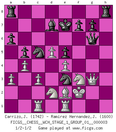 Last move : 1/2-1/2 2007 November 8 23:8:27 [Event "FICGS__CHESS__WCH_STAGE_1_GROUP_01__000003"] [Site "FICGS"] [Date "2007.07.11"] [Round "1"] [White "Carrizo,Jose"] [Black "Ramirez Hernandez,Jose Antonio"] [Result "1/2-1/2"] [WhiteElo "1742"] [BlackElo "1600"] 1.e4 e5 2.Nf3 Nc6 3.Bb5 a6 4.Ba4 Nf6 5.O-O Be7 6.Re1 b5 7.Bb3 d6 8.c3 O-O 9.h3 Na5 10.Bc2 c6 11.d4 Qc7 12.Nbd2 Be6 13.Nf1 c5 14.d5 Bd7 15.g4 h5 16.N3h2 hxg4 17.hxg4 Nh7 18.Qf3 Bg5 19.Qg3 Rfb8 20.Bd3 c4 21.Be2 Nb7 22.Nf3 Bxc1 23.Raxc1 Nc5 24.N1d2 Nf6 25.Ng5 Qa5 26.a3 Qd8 27.Qh4 Kf8 28.f4 Qb6 29.Kg2 Ke7 30.fxe5 dxe5 31.Qg3 Qd6 32.Bxc4 Nxg4 33.Be2 Qg6 34.Ngf3 Rh8 35.b4 Ne3+ 36.Kf2 Ng4+ 37.Kg2 Ne3+ 38.Kf2 1/2-1/2 Ruy Lopez : Closed Kingside Castling by player White (move 5) Kingside Castling by player Black (move 8) This chess game ended in a draw. Follow this game move after move (download)Is Bobby Fischer quite sane ? (Salo Flohr) Im Spitzenschach von heute geht es nur um Vorbereitung, um tiefgründige, sorgfältige Eröffnungsvorbereitung. (Nigel Short) El Ajedrez es en su esencia, un juego. En su forma, un arte. Y en su ejecución, una ciencia. (Baron Tassilo) Même si l'adversaire joue le coup analysé précédemment, recommencez l'analyse en voyant la nouvelle position. Première règle de Blumenfeld If you are going through hell, keep going. (Winston Churchill)
