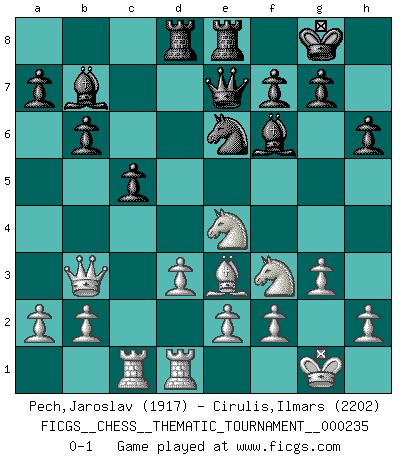 Last move : 0-1 2020 July 9 11:7:22 [Event "FICGS__CHESS__THEMATIC_TOURNAMENT__000235"] [Site "FICGS"] [Date "2020.03.02"] [Round "1"] [White "Pech,Jaroslav"] [Black "Cirulis,Ilmars"] [Result "0-1"] [WhiteElo "1917"] [BlackElo "2202"] 1.c4 Nf6 2.Nc3 c5 3.g3 d5 4.cxd5 Nxd5 5.Bg2 Nc7 6.d3 e5 7.Be3 Ne6 8.Rc1 Nc6 9.Nf3 Be7 10.O-O Bd7 11.Nd2 O-O 12.Nc4 b6 13.Bxc6 Bxc6 14.Nxe5 Bb7 15.Qa4 Bf6 16.Nf3 Qe7 17.Qb3 Rfe8 18.Ne4 Rad8 19.Rfd1 h6 0-1 This chess game has been lost on time (started : 2020.03.02 16:36:40) English Opening Kingside Castling by player White (move 10) Kingside Castling by player Black (move 11) Player Black won this chess game. Follow this game move after move (download)He who takes the Queen's Knight's Pawn will sleep in the streets. (Anonymous) Über Kasparov: Es ist offensichtlich, daß er in einem totalitären Staat aufwuchs und deshalb zu diktatorischen Zügen neigt. (Viktor Kortschnoi) Siempre es mucho mejor sacrificar las piezas de tu oponente. (Savielly Tartakover) C'est une question de caractère, Beaucoup de gens perdent leur motivation très vite. D'autres, ils sont rares, peuvent la conserver très longtemps. J'aime les échecs, encore aujourd'hui je suis heureux d'analyser des parties. J'aime toujours gagner, je déteste encore perdre. Bien jouer est important pour mon intégrité intellectuelle et morale. Et puis les échecs vivent en ce moment une période historique grâce à Internet. Ils se développent dans les systèmes éducatifs à travers le monde. Ils sortent de leur ghetto, et c'est mon rôle de mener à bien cette révolution. (Gary Kasparov) Perception is reality. (Immanuel Kant)
