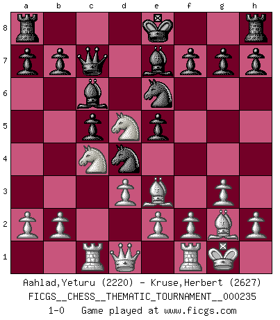 Last move : 1-0 2020 March 18 3:45:13 [Event "FICGS__CHESS__THEMATIC_TOURNAMENT__000235"] [Site "FICGS"] [Date "2020.03.02"] [Round "1"] [White "Aahlad,Yeturu"] [Black "Kruse,Herbert"] [Result "1-0"] [WhiteElo "2220"] [BlackElo "2627"] 1.c4 Nf6 2.Nc3 c5 3.g3 d5 4.cxd5 Nxd5 5.Bg2 Nc7 6.d3 e5 7.Be3 Be7 8.Rc1 Ne6 9.Nf3 Nc6 10.Na4 Qa5+ 11.Nd2 Bd7 12.O-O Ncd4 13.Nc3 Bc6 14.Nc4 Qc7 15.Nd5 1-0 Alexander Marciz coronavirus? Herbert Kruse unrated English Opening Kingside Castling by player White (move 12) Player White won this chess game. Follow this game move after move (download)If Chess is a science, it's a most inexact one. If Chess is an art, it is too exacting to be seen as one. If Chess is a sport, it's too esoteric. If Chess is a game, it's too demanding to be just a game. If Chess is a mistress, she's a demanding one. If Chess is a passion, it's a rewarding one. If Chess is life, it's a sad one. (Unknown) Mutter, ich bin eben Ex-Weltmeister geworden. --beim nach Hause Kommen nach dem Verlust des WM-Titels an Mihail Botvinnik -- (Mikhail Nekhemyevich Tal) El Ajedrez es parte de la cultura, y si una cultura esta en decadencia, entonces también el Ajedrez declinará. (Mikhail Botvinnik) On est toujours la mazette de quelqu'un d'autre. (Anonyme) There are two kinds of people in the world, my friend. Those who have a loaded gun and those who dig. You dig ! (Blondie in The Good, The Bad and The Ugly)