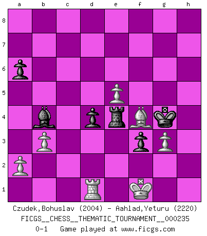 Last move : 0-1 2020 December 27 16:42:37 [Event "FICGS__CHESS__THEMATIC_TOURNAMENT__000235"] [Site "FICGS"] [Date "2020.03.02"] [Round "1"] [White "Czudek,Bohuslav"] [Black "Aahlad,Yeturu"] [Result "0-1"] [WhiteElo "2004"] [BlackElo "2220"] 1.c4 Nf6 2.Nc3 c5 3.g3 d5 4.cxd5 Nxd5 5.Bg2 Nc7 6.Nf3 Nc6 7.O-O e5 8.d3 Be7 9.Nd2 O-O 10.Nc4 f6 11.Bxc6 bxc6 12.Qa4 Bh3 13.Qxc6 Bxf1 14.Kxf1 Qc8 15.Nd5 Nxd5 16.Qxd5+ Kh8 17.Bd2 Qh3+ 18.Kg1 Rad8 19.Qb7 Qd7 20.Qa6 Rfe8 21.Bc3 Bf8 22.f3 h5 23.b3 Re6 24.Qa3 Kh7 25.Rc1 Rde8 26.Qb2 g6 27.Qa1 Bh6 28.Rf1 f5 29.Kg2 g5 30.Kg1 Kg8 31.Qb1 Rf8 32.Kg2 g4 33.e4 f4 34.fxg4 hxg4 35.Nxe5 Qg7 36.Qb2 Kh7 37.Rf2 f3+ 38.Kh1 Qg5 39.Kg1 Rxe5 40.Bxe5 Qe3 41.Bc3 Qxd3 42.Bd2 Bg7 43.e5 Rd8 44.Bg5 Rd4 45.Bf4 Re4 46.Qd2 Qd4 47.Qxd4 cxd4 48.Rd2 Kg6 49.Kf2 Kf5 50.h3 Bf8 51.hxg4+ Kxg4 52.Kf1 Bb4 53.Rd1 a6 0-1 Follow this game move after move (download)Human affairs are like a Chess game: only those who do not take it seriously can be called good players. (Hung Tzu Ch'eng) Die unerbitterlichsten Regeln im Schach sind die Ausnahmen. (Savielly Grigorievitsch Tartakower) Cada Peón es potencialmente una Reina. (James Mason) La tactique est l'élément le plus important du milieu de jeu. (Siegbert Tarrasch) The quality of decision is like the well-timed swoop of a falcon which enables it to strike and destroy its victim. (Sun Tzu)