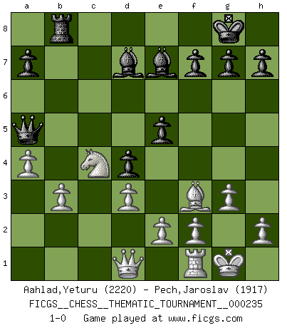 Last move : 1-0 2020 July 26 9:48:48 [Event "FICGS__CHESS__THEMATIC_TOURNAMENT__000235"] [Site "FICGS"] [Date "2020.03.02"] [Round "1"] [White "Aahlad,Yeturu"] [Black "Pech,Jaroslav"] [Result "1-0"] [WhiteElo "2220"] [BlackElo "1917"] 1.c4 Nf6 2.Nc3 c5 3.g3 d5 4.cxd5 Nxd5 5.Bg2 Nc7 6.d3 e5 7.Be3 Be7 8.Rc1 Ne6 9.Nf3 Nc6 10.Na4 Qa5+ 11.Nd2 Ned4 12.Bxd4 cxd4 13.Rxc6 bxc6 14.Bxc6+ Bd7 15.Bxa8 O-O 16.Bf3 Bxa4 17.b3 Bb5 18.a4 Bd7 19.O-O Rb8 20.Nc4 1-0 English Opening Kingside Castling by player Black (move 15) Kingside Castling by player White (move 19) Player White won this chess game. Follow this game move after move (download)We must make sure that Chess will not be like a dead language, very interesting, but for a very small group. (Sytze Faber) Kostenjuk hat keinen Sexappeal. (Loek van Wely) Hasta este punto, las blancas han seguido un análisis bien conocido. Pero ahora el hace un error fatal: empieza a usar su propia cabeza. (Siegbert Tarrasch) Votre seul travail dans les ouvertures est d'obtenir un milieu de partie jouable. (Lajos Portish) Mac users swear by their computers. PC users swear at their computers. (Author unknown)
