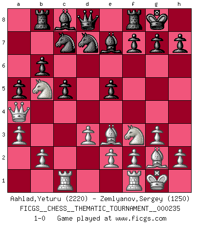 Last move : 1-0 2020 May 29 16:41:30 [Event "FICGS__CHESS__THEMATIC_TOURNAMENT__000235"] [Site "FICGS"] [Date "2020.03.02"] [Round "1"] [White "Aahlad,Yeturu"] [Black "Zemlyanov,Sergey"] [Result "1-0"] [WhiteElo "2220"] [BlackElo "1250"] 1.c4 Nf6 2.Nc3 c5 3.g3 d5 4.cxd5 Nxd5 5.Bg2 Nc7 6.d3 e5 7.Be3 Be7 8.Rc1 Nd7 9.Nf3 O-O 10.O-O b6 11.Qa4 Rb8 12.a3 a5 13.Nb5 1-0 This chess game has been lost on time (started : 2020.03.02 16:36:40) English Opening Kingside Castling by player Black (move 9) Kingside Castling by player White (move 10) Player White won this chess game. Follow this game move after move (download)Kasparov : J'adoube , Ivanchuk : S'il vous plaît ! (Garry Kasparov & Vassily Ivanchuk, Linares 1997) Die meiste Zeit treffe ich auf Gegner, die meine Enkel sein könnten. Ich bin da, um ihnen zu zeigen, dass sie von mir noch einiges lernen können. (Viktor Kortschnoi) Algunos sacrificios son sólidos, los demás son mÃos. (Mikhail Tal) Des points faibles ou des trous dans la position de l'adversaire doivent être occupés par des pièces et non pas par des pions. (Siegbert Tarrasch) If computers get too powerful, we can organize them into committees. That'll do them in. (Anonymous)