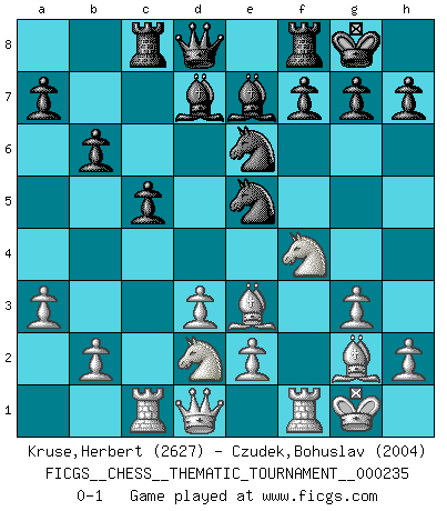 Last move : 0-1 2020 March 25 15:21:27 [Event "FICGS__CHESS__THEMATIC_TOURNAMENT__000235"] [Site "FICGS"] [Date "2020.03.02"] [Round "1"] [White "Kruse,Herbert"] [Black "Czudek,Bohuslav"] [Result "0-1"] [WhiteElo "2627"] [BlackElo "2004"] 1.c4 Nf6 2.Nc3 c5 3.g3 d5 4.cxd5 Nxd5 5.Bg2 Nc7 6.d3 e5 7.Be3 Ne6 8.Nf3 Nc6 9.Rc1 Bd7 10.O-O Be7 11.Nd5 O-O 12.Nd2 Rc8 13.a3 b6 14.f4 exf4 15.Nxf4 Ne5 0-1 English Opening Kingside Castling by player White (move 10) Kingside Castling by player Black (move 11) Player Black won this chess game. Follow this game move after move (download)A bad plan is better than none at all. (Frank Marshall) Oft bringt ein stiller Zug das Erdbeben. (Richard Reti) El Jaque al descubierto es el bombardero del tablero. (Reuben Fine) Les Echecs sont affaire de jugement sensible. Savoir quand frapper et quand esquiver. (Fischer) For peace of mind, resign as general manager of the universe. (Douglas Adams)
