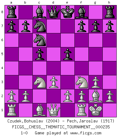 Last move : 1-0 2020 May 14 22:16:37 [Event "FICGS__CHESS__THEMATIC_TOURNAMENT__000235"] [Site "FICGS"] [Date "2020.03.02"] [Round "1"] [White "Czudek,Bohuslav"] [Black "Pech,Jaroslav"] [Result "1-0"] [WhiteElo "2004"] [BlackElo "1917"] 1.c4 Nf6 2.Nc3 c5 3.g3 d5 4.cxd5 Nxd5 5.Bg2 Nc7 6.Nf3 Nc6 7.O-O e5 8.d3 1-0 This chess game has been lost on time (started : 2020.03.02 16:36:40) English Opening Kingside Castling by player White (move 7) Player White won this chess game. Follow this game move after move (download)Do you realize Fischer almost never has any bad pieces? He exchanges them, and the bad pieces remain with his opponents. (Yuri Balashov) Ich erzeugte keinen Neid, da mich die Schachspieler als Musiker und die Musiker als Schachspieler betrachteten. (Mark Taimanov) Todavía soy una víctima del Ajedrez. Tiene toda la belleza del arte y mucho mas. No puede ser comercializado. El Ajedrez es mas puro que el arte en su posición social. (Marcel Duchamp) Même un GMI sait rarement calculer sur plus de cinq coups une attaque à sacrifices. (Rudolf Spielmann) You lose, general Kenobi. (General Grievous in Star Wars ep.3)