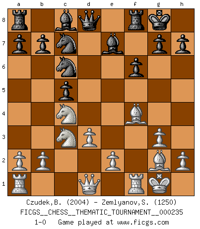 Last move : 1-0 2020 June 2 11:18:14 [Event "FICGS__CHESS__THEMATIC_TOURNAMENT__000235"] [Site "FICGS"] [Date "2020.03.02"] [Round "1"] [White "Czudek,Bohuslav"] [Black "Zemlyanov,Sergey"] [Result "1-0"] [WhiteElo "2004"] [BlackElo "1250"] 1.c4 Nf6 2.Nc3 c5 3.g3 d5 4.cxd5 Nxd5 5.Bg2 Nc7 6.Nf3 Nc6 7.O-O e5 8.d3 Be7 9.Nd2 O-O 10.Nc4 f6 11.f4 exf4 12.Bxf4 1-0 This chess game has been lost on time (started : 2020.03.02 16:36:40) English Opening Kingside Castling by player White (move 7) Kingside Castling by player Black (move 9) Player White won this chess game. Follow this game move after move (download)I play correspondence chess because it is both art and science while chess is art only. (A player at FICGS) Um dein Spiel zu verbessern musst du zuallererst das Endspiel studieren, denn diese kann unabhängig studiert werden. Die Eröffnung und das Mittelspiel müssen immer in Bezug gesetzt werden zum Endspiel. (José Raúl Capablanca) El Ajedrez lo es todo: arte, ciencia y deporte. (Anatoly Karpov) Même si l'adversaire joue le coup analysé précédemment, recommencez l'analyse en voyant la nouvelle position. Première règle de Blumenfeld However beautiful the strategy, you should occasionally look at the results. (Winston Churchill)