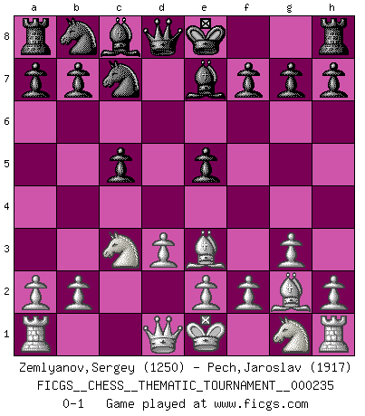 Last move : 0-1 2020 June 1 20:37:51 [Event "FICGS__CHESS__THEMATIC_TOURNAMENT__000235"] [Site "FICGS"] [Date "2020.03.02"] [Round "1"] [White "Zemlyanov,Sergey"] [Black "Pech,Jaroslav"] [Result "0-1"] [WhiteElo "1250"] [BlackElo "1917"] 1.c4 Nf6 2.Nc3 c5 3.g3 d5 4.cxd5 Nxd5 5.Bg2 Nc7 6.d3 e5 7.Be3 Be7 0-1 This chess game has been lost on time (started : 2020.03.02 16:36:40) English Opening Player Black won this chess game. Follow this game move after move (download)Pawns are born free, yet they are everywhere in chains. (Rick Kennedy) Gott hat gewollt, dass ich Champion werde. (Surab Azmajparaschvili) No es una movida, aún la mejor movida que tu debas buscar, sino un plan comprensible. (Eugene Znosko-Borovsky) A chaque perte on perd un peu de soi. (Joël Lautier) I have opinions of my own - strong opinions - but I don't always agree with them. (George Bush)
