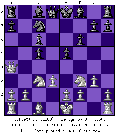 Last move : 1-0 2020 May 12 19:25:33 [Event "FICGS__CHESS__THEMATIC_TOURNAMENT__000235"] [Site "FICGS"] [Date "2020.03.02"] [Round "1"] [White "Schuett,Wilhelm"] [Black "Zemlyanov,Sergey"] [Result "1-0"] [WhiteElo "1800"] [BlackElo "1250"] 1.c4 Nf6 2.Nc3 c5 3.g3 d5 4.cxd5 Nxd5 5.Bg2 Nc7 6.Qb3 Nc6 7.Bxc6+ bxc6 8.d3 e5 9.Nf3 f6 10.Qa4 1-0 This chess game has been lost on time (started : 2020.03.02 16:36:40) English Opening Player White won this chess game. Follow this game move after move (download)When your house is on fire, you can't be bothered with the neighbors. Or, as we say in Chess, if your King is under attack you don't worry about losing a Pawn on the Queen's side. (Gary Kasparov) Es ist wirklich schade, dass so viele Schachspieler nicht auf ihr Äußeres achten! (Alexandra Kosteniuk) El Ajedrez es un regaderazo frío para la mente. (Sir John Simon) Il vaut mieux sacrifier les pièces de l'adversaire. (Xavier Tartacover) Always remember that you are unique; just like everyone else. (Unknown)