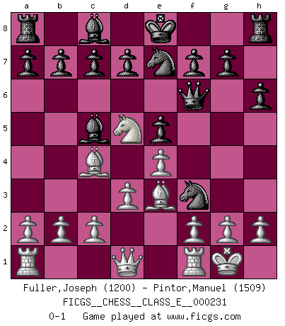 Last move : 0-1 2020 March 8 17:48:21 [Event "FICGS__CHESS__CLASS_E__000231"] [Site "FICGS"] [Date "2020.03.02"] [Round "1"] [White "Fuller,Joseph"] [Black "Pintor,Manuel"] [Result "0-1"] [WhiteElo "1200"] [BlackElo "1509"] 1.e4 e5 2.Nf3 Nc6 3.Bc4 Bc5 4.O-O Qf6 5.Nc3 Nge7 6.d3 h6 7.Be3 Nd4 8.Nd5 Nxf3+ 0-1 Giuoco Piano Kingside Castling by player White (move 4) Player Black won this chess game. Follow this game move after move (download)The isolated Pawn casts gloom over the entire chessboard. (Aaron Nimzovich) Der Verteidiger gebe der Gewalt nach, aber nur der Gewalt. Er schaffe sich nicht freiwillig, etwa aus Blindheit oder aus Schrecken, irgendwelche Schwächen. Er lasse sich nicht bluffen. (Emanuel Lasker) Hasta este punto, las blancas han seguido un análisis bien conocido. Pero ahora el hace un error fatal: empieza a usar su propia cabeza. (Siegbert Tarrasch) Le plus grand jeu de l'esprit jamais inventé, plus vous l'apprenez, plus vous y prenez du plaisir. (Garry Kasparov) Life is pleasant. Death is peaceful. It's the transition that's troublesome. (Isaac Asimov)