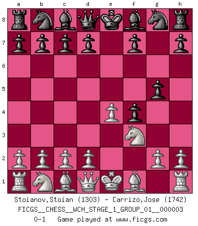 Last move : 0-1 2007 August 15 9:38:48 [Event "FICGS__CHESS__WCH_STAGE_1_GROUP_01__000003"] [Site "FICGS"] [Date "2007.07.11"] [Round "1"] [White "Stoianov,Stoian"] [Black "Carrizo,Jose"] [Result "0-1"] [WhiteElo "1303"] [BlackElo "1742"] 1.e4 e5 2.f4 exf4 3.Nf3 g5 0-1 This chess game has been lost on time (started : 2007.07.11 16:47:33) King's knight's gambit Player Black won this chess game. Follow this game move after move (download)Chess is a terrible game. If you have no center, your opponent has a freer position. If you do have a center, then you really have something to worry about ! (Siegbert Tarrasch) Ein Remis kann durch Wiederholung von drei Zügen oder durch einen schlechte Zug erreicht werden. (Savielly Grigorievitsch Tartakower) Aquel que toma al Peón de Caballo de la Reina, se pasará la noche a dormir en la calle. (Anónimo) Il vaut mieux sacrifier les pièces de l'adversaire. (Xavier Tartacover) Think like a man of action, act like a man of thought. (Henri Louis Bergson)
