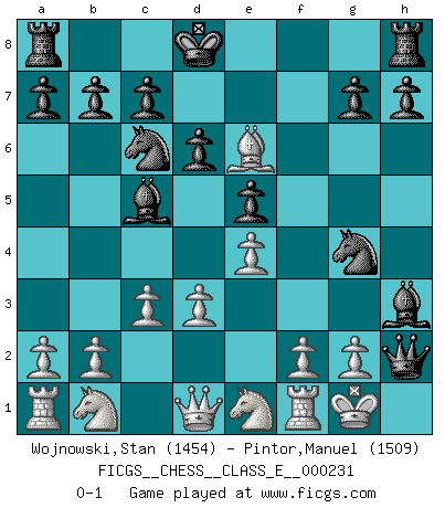 Last move : 0-1 2020 March 13 0:34:18 [Event "FICGS__CHESS__CLASS_E__000231"] [Site "FICGS"] [Date "2020.03.02"] [Round "1"] [White "Wojnowski,Stan"] [Black "Pintor,Manuel"] [Result "0-1"] [WhiteElo "1454"] [BlackElo "1509"] 1.e4 e5 2.Nf3 Nc6 3.Bc4 Qf6 4.c3 Bc5 5.d3 d6 6.Bg5 Qg6 7.O-O Bg4 8.Bh4 Nh6 9.h3 Bxh3 10.Bg3 Qxg3 11.Ne1 Ng4 12.Bxf7+ Kd8 13.Be6 Qh2+ 0-1 King's pawn game Kingside Castling by player White (move 7) Player Black won this chess game. Follow this game move after move (download)Chess demands total concentration. (Bobby Fischer) Schach ist ein Reich, wo sich die menschliche Phantasie frei entfalten kann. (David Bronstein) No todos los artistas son jugadores de Ajedrez, pero todos los jugadores de Ajedrez son artistas. (Marcel Duchamp) Les échecs, c'est la lutte contre l'erreur. (Johannes Zukertort) Horse racing is animated roulette. (Roger Kahn)
