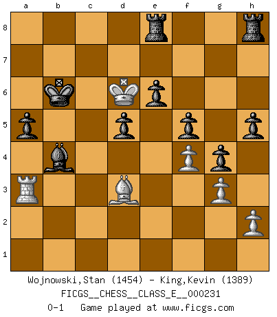 Last move : 0-1 2020 April 28 2:55:30 [Event "FICGS__CHESS__CLASS_E__000231"] [Site "FICGS"] [Date "2020.03.02"] [Round "1"] [White "Wojnowski,Stan"] [Black "King,Kevin"] [Result "0-1"] [WhiteElo "1454"] [BlackElo "1389"] 1.e4 e6 2.d4 d5 3.e5 c5 4.c3 Nc6 5.Nf3 Bd7 6.a3 Nge7 7.Bg5 Qb6 8.b4 cxd4 9.cxd4 Nf5 10.Nc3 Nfxd4 11.Na4 Nxf3+ 12.Qxf3 Qd4 13.Rc1 Nxe5 14.Qc3 Qe4+ 15.Qe3 Bxa4 16.Rc7 Bc6 17.b5 Qb1+ 18.Qc1 Qxc1+ 19.Bxc1 Kd8 20.bxc6 Kxc7 21.cxb7 Kxb7 22.Be2 Kc6 23.O-O Nc4 24.Bf4 Bxa3 25.Ra1 Bd6 26.Bxc4 Bxf4 27.Bd3 a5 28.Ra4 Bd6 29.Kf1 f5 30.Ke2 Bb4 31.Ke3 g5 32.g3 Kb6 33.f4 g4 34.Kd4 Rad8 35.Ke5 Rde8 36.Ra2 Bc3+ 37.Kd6 h5 38.Ra3 Bb4+ 0-1 French : Advance, Euwe variation Kingside Castling by player White (move 23) Player Black won this chess game. Follow this game move after move (download)Modern Chess is too much concerned with things like Pawn structure. Forget it, Checkmate ends the game. (Nigel Short) Wenn Schach ein enormer Dschungel ist, der seine Myriaden von Geheimnissen nicht preisgeben will, dann sind Computer die Kettensägen einer gewaltigen ökologisch unsensiblen Nutzholzfirma. (Nigel Short) Aquellos que dicen entender al Ajedrez, no entienden nada. (Robert Hubner) Le génie consiste à savoir transgresser les règles au moment opportun. (Teichmann) There is no vagueness without wind. (Chinese proverb)