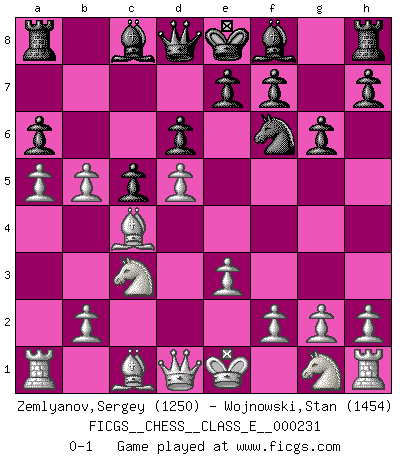 Last move : 0-1 2020 April 17 15:33:35 [Event "FICGS__CHESS__CLASS_E__000231"] [Site "FICGS"] [Date "2020.03.02"] [Round "1"] [White "Zemlyanov,Sergey"] [Black "Wojnowski,Stan"] [Result "0-1"] [WhiteElo "1250"] [BlackElo "1454"] 1.d4 Nf6 2.c4 c5 3.d5 b5 4.cxb5 a6 5.e3 d6 6.Nc3 Nbd7 7.a4 Nb6 8.a5 Nc4 9.Bxc4 g6 0-1 This chess game has been lost on time (started : 2020.03.02 16:37:2) Benko gambit half accepted Player Black won this chess game. Follow this game move after move (download)As one by one I mowed them down, my superiority soon became apparent. (Jose Capablanca) Bis jetzt ist Weiß einer wohlbekannten Analyse gefolgt. Aber jetzt begeht er einen schrecklichen Fehler: Er beginnt seinen eigenen Kopf zu benutzen. (Siegbert Tarrasch) El sobresalir en el Ajedrez es un signo de una mente intrigante. (Sir Arthur Conan Doyle) Toutes choses étant égales, c'est la conviction qui gagne. Alliée à une volonté de vaincre, elle sert de détonateur, suscite des idées, disperse les doutes et aide à penser clairement. (Robert Fischer) There will be no order, only chaos. (Sol Robeson in Pi by Darren Aronofsky)