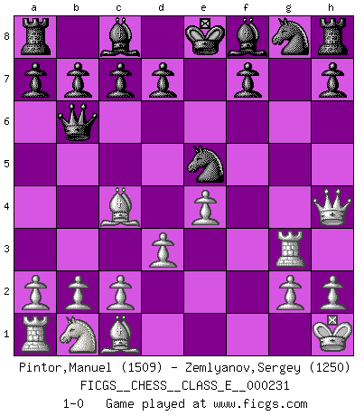 Last move : 1-0 2020 May 23 12:24:50 [Event "FICGS__CHESS__CLASS_E__000231"] [Site "FICGS"] [Date "2020.03.02"] [Round "1"] [White "Pintor,Manuel"] [Black "Zemlyanov,Sergey"] [Result "1-0"] [WhiteElo "1509"] [BlackElo "1250"] 1.e4 e5 2.f4 exf4 3.Nf3 g5 4.Bc4 g4 5.O-O gxf3 6.Qxf3 Qf6 7.d3 Nc6 8.Qh5 Qg6 9.Qh4 f3 10.Rxf3 Ne5 11.Rg3 Qb6+ 12.Kh1 1-0 This chess game has been lost on time (started : 2020.03.02 16:37:2) KGA : Muzio gambit Kingside Castling by player White (move 5) Player White won this chess game. Follow this game move after move (download)The hallmark of the artist is simplicity. (Larry Evans) Mein erstes Ziel war nicht, die Partie zu gewinnen, sondern eine Figur zu opfern. -- der junge (Wilhelm Steinitz) Fischer era un maestro de claridad y un Rey del posicionamiento astuto. Sus oponentes podían ver hacia donde se dirigía pero eran impotentes para detenerlo. (Bruce Pandolfini) La vérité est comme le meilleur coup aux échecs : elle existe, mais il faut la chercher. (Arturo Perez-Reverte) Strategy without tactics is the slowest route to victory. Tactics without strategy is the noise before defeat. (Sun Tzu)