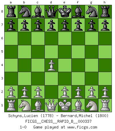 Last move : 1-0 2020 April 1 22:52:45 [Event "FICGS__CHESS__RAPID_B__000337"] [Site "FICGS"] [Date "2020.03.02"] [Round "1"] [White "Schyns,Lucien"] [Black "Bernard,Michel"] [Result "1-0"] [WhiteElo "1778"] [BlackElo "1800"] 1.d4 1-0 This chess game has been lost on time (started : 2020.03.02 18:9:30) Queen's pawn Player White won this chess game. Follow this game move after move (download)Everything is in a state of flux, and this includes the world of Chess. (Mikhail Botvinnik) Rauchen ist dem Schachspieler bei seiner Arbeit, also im Wettkampf, untersagt. (Viktor Kortschnoi) Ciertamente el estado mental actual de Bobby Fischer es una tragedia. Uno de los mas grandes jugadores de Ajedrez del mundo -el orgullo y pena del Ajedrez Americano. (Frank Brady) Les pièces de l'échiquier étaient impitoyables. Elles le retenaient, elles l'absorbaient. Il y avait de l'horreur en cela, mais aussi une harmonie unique. Car, qu'y a-t-il dans le monde, à part les échecs ? (V. Nabokov) What doesn't kill us makes us stronger. (Friedrich Nietzsche)