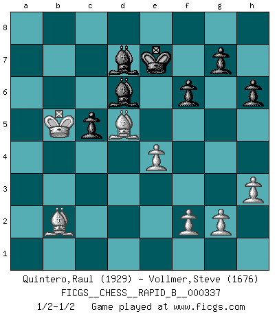 Last move : 1/2-1/2 2020 April 10 0:23:10 [Event "FICGS__CHESS__RAPID_B__000337"] [Site "FICGS"] [Date "2020.03.02"] [Round "1"] [White "Quintero,Raul"] [Black "Vollmer,Steve"] [Result "1/2-1/2"] [WhiteElo "1929"] [BlackElo "1676"] 1.Nf3 d5 2.b3 c5 3.e3 Nf6 4.Bb2 e6 5.Bb5+ Bd7 6.a4 Be7 7.O-O O-O 8.d4 a6 9.Bd3 Nc6 10.c3 Qc7 11.Nbd2 e5 12.dxe5 Nxe5 13.Nxe5 Qxe5 14.Qc2 Bd6 15.Nf3 Qe7 16.h3 Ne4 17.Rad1 b5 18.axb5 axb5 19.c4 bxc4 20.bxc4 Bc6 21.cxd5 Bxd5 22.Ra1 h6 23.Rfd1 Rfd8 24.Rxa8 Bxa8 25.Nd2 Nxd2 26.Rxd2 Bc6 27.Bc4 Qc7 28.Qc3 Bf8 29.Rd3 Rxd3 30.Qxd3 Qd7 31.Qxd7 Bxd7 32.Kf1 Bd6 33.Ke2 Kf8 34.Kd3 f6 35.Bd5 Ke7 36.Kc4 Bc8 37.Kb5 Be6 38.e4 Bd7+ 39.Bc6 Be6 40.Bd5 Bd7+ 41.Kc4 Bc8 42.Kb5 Bd7+ 1/2-1/2 Reti : Nimzovich-Larsen attack Kingside Castling by player White (move 7) Kingside Castling by player Black (move 7) This chess game ended in a draw. Follow this game move after move (download)I played Chess with him and would have beaten him sometimes only he always took back his last move, and ran the game out differently. (Mark Twain) Schach verlangt totale Konzentration. (Robert James Fischer) En un gambito tu regalas un Peón por el bién de tomar un juego perdido. (Samuel Standige Boden) Ne tendez aucun piège pour le plaisir ! Ne jouez rien dans l'espoir que l'adversaire réagisse de façon stupide ! Prenez toujours pour acquis que l'adversaire va trouver le meilleur coup ! Ne jouez jamais de coup dans l'espoir que l'adversaire ne voie pas la menace ! Chacun de vos coups doit améliorer la position d'une façon ou d'une autre. Quotation,n.: The act of repeating erroneously the words of another. The words erroneously repeated. (Ambrose Bierce, The Devil's Dictionary)