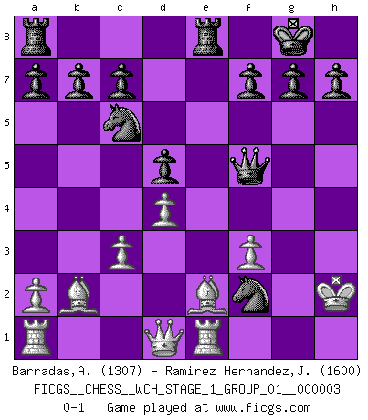 Last move : 0-1 2007 August 28 17:10:18 [Event "FICGS__CHESS__WCH_STAGE_1_GROUP_01__000003"] [Site "FICGS"] [Date "2007.07.11"] [Round "1"] [White "Barradas,Anderson"] [Black "Ramirez Hernandez,Jose Antonio"] [Result "0-1"] [WhiteElo "1307"] [BlackElo "1600"] 1.e4 e5 2.Nf3 Nc6 3.Bc4 Bc5 4.c3 Nf6 5.d4 exd4 6.cxd4 Bb4+ 7.Nc3 Nxe4 8.O-O Bxc3 9.bxc3 d5 10.Bb5 O-O 11.Bb2 Bg4 12.h3 Bxf3 13.gxf3 Ng5 14.Kh2 Qf6 15.Be2 Rfe8 16.Re1 Qf5 17.Kg1 Nxh3+ 18.Kh2 Nxf2 0-1 Giuoco Piano : Greco's attack Kingside Castling by player White (move 8) Kingside Castling by player Black (move 10) Player Black won this chess game. Follow this game move after move (download)I have added these principles to the law: get the Knights into action before both Bishops are developed. (Emanuel Lasker) Als ich elf wurde, wurde ich einfach gut. (Robert James Fischer) Ciertamente el estado mental actual de Bobby Fischer es una tragedia. Uno de los mas grandes jugadores de Ajedrez del mundo -el orgullo y pena del Ajedrez Americano. (Frank Brady) Les échecs sont un jeu terrible. Si vous n'avez pas le centre, votre adversaire a une position plus libre. Par contre, si vous avez le centre, alors vous avez vraiment quelque chose pour laquelle vous inquiéter ! (Siegbert Tarrasch) Without enthusiasm, virtue functions not at all, and vice only poorly. (Mignon McLaughlin, The Neurotic's Notebook, 1960)