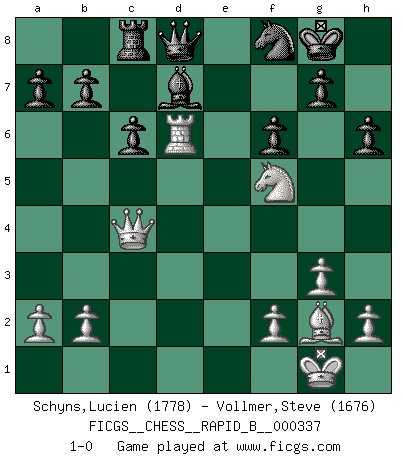Last move : 1-0 2020 March 28 13:28:53 [Event "FICGS__CHESS__RAPID_B__000337"] [Site "FICGS"] [Date "2020.03.02"] [Round "1"] [White "Schyns,Lucien"] [Black "Vollmer,Steve"] [Result "1-0"] [WhiteElo "1778"] [BlackElo "1676"] 1.d4 Nf6 2.c4 e6 3.g3 d5 4.cxd5 exd5 5.Nf3 Bb4+ 6.Nc3 O-O 7.Bg2 Nc6 8.O-O Re8 9.Bf4 Bd6 10.Bg5 Be7 11.Qb3 h6 12.Bxf6 Bxf6 13.Nxd5 Rxe2 14.Rae1 Rxe1 15.Rxe1 Bxd4 16.Nxd4 Nxd4 17.Qc3 Ne6 18.Rd1 c6 19.Ne3 Bd7 20.Nf5 Rc8 21.Rd6 f6 22.Qd3 Nf8 23.Qc4+ 1-0 Catalan Opening Kingside Castling by player Black (move 6) Kingside Castling by player White (move 8) Player White won this chess game. Follow this game move after move (download)Only sissies Castle. (Rob Sillars) Das ganze Leben mit einer Ehefrau ist wie ein Endspiel mit ungleichfarbigen Läufern. (Viktor Kortschnoi) La partida mas dura de ganar es una partida ganada. (Emanuel Lasker) Je ne crois pas en la psychologie, je crois aux bons coups. (Robert Fischer) Never risk one's whole fortune unless supported by one's entire army. (Niccolo Machiavelli)