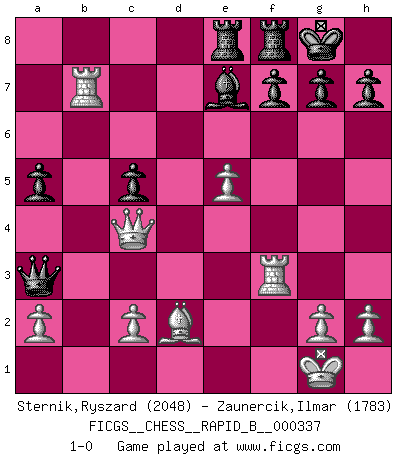Last move : 1-0 2020 April 9 10:28:43 [Event "FICGS__CHESS__RAPID_B__000337"] [Site "FICGS"] [Date "2020.03.02"] [Round "1"] [White "Sternik,Ryszard"] [Black "Zaunercik,Ilmar"] [Result "1-0"] [WhiteElo "2048"] [BlackElo "1783"] 1.e4 e5 2.Nf3 Nc6 3.d4 exd4 4.Bc4 Nf6 5.e5 d5 6.Bb5 Nd7 7.O-O Be7 8.Bxc6 bxc6 9.Nxd4 Nxe5 10.f4 c5 11.fxe5 cxd4 12.Qxd4 c5 13.Qd3 O-O 14.Nc3 Bb7 15.Bf4 Qb6 16.Nxd5 Bxd5 17.Qxd5 Qxb2 18.Be3 Rad8 19.Qe4 Qb6 20.Rab1 Qa5 21.Rb7 Rde8 22.Qc4 Qa3 23.Bd2 a5 24.Rf3 1-0 Scotch gambit : Dubois-Reti defense Kingside Castling by player White (move 7) Kingside Castling by player Black (move 13) Player White won this chess game. Follow this game move after move (download)Chess is a terrible game. If you have no center, your opponent has a freer position. If you do have a center, then you really have something to worry about ! (Siegbert Tarrasch) Ein Remis kann durch Wiederholung von drei Zügen oder durch einen schlechte Zug erreicht werden. (Savielly Grigorievitsch Tartakower) Debemos de asegurarnos de que el Ajedrez no se convierta en un lenguaje muerto, muy interesante, pero solo para un grupo muy pequeño. (Sytze Faber) Le joueur d'Echecs qui veut atteindre le top est obligé de développer son propre credo créatif. Alexeï Stepanovicth Souétine. Il est facile d'écrire des livres ! Ce qui est difficile, c'est de jouer ! (Alexeï Stepanovicth Souétine) The only difference between a tax man and a taxidermist is that the taxidermist leaves the skin. (Mark Twain)