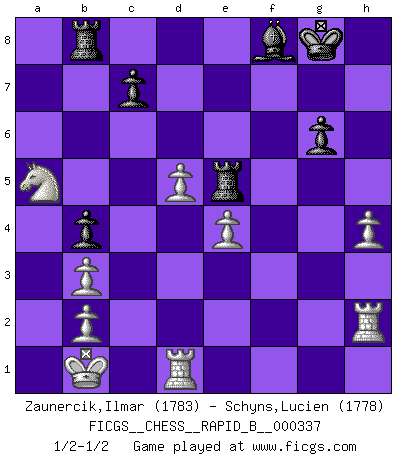 Last move : 1/2-1/2 2020 March 28 11:42:3 [Event "FICGS__CHESS__RAPID_B__000337"] [Site "FICGS"] [Date "2020.03.02"] [Round "1"] [White "Zaunercik,Ilmar"] [Black "Schyns,Lucien"] [Result "1/2-1/2"] [WhiteElo "1783"] [BlackElo "1778"] 1.e4 g6 2.d4 d5 3.exd5 Qxd5 4.Nc3 Qd6 5.Nf3 Bg7 6.Be3 Nf6 7.h3 Nc6 8.Be2 O-O 9.Qd2 e6 10.h4 h5 11.O-O-O Nd5 12.Ne4 Qb4 13.c3 Qa5 14.Bc4 Nxe3 15.fxe3 b5 16.Bb3 b4 17.c4 e5 18.d5 Nd8 19.Qc2 Bf5 20.c5 Bxe4 21.Qxe4 Qxc5+ 22.Kb1 Qd6 23.g4 Nb7 24.gxh5 Nc5 25.Qg4 Nxb3 26.axb3 a5 27.hxg6 Qxg6+ 28.Qxg6 fxg6 29.Ng5 e4 30.Rh2 Rf5 31.Nxe4 Re5 32.Nc5 Rd8 33.e4 Bf8 34.Nb7 Rb8 35.Nxa5 1/2-1/2 Robatsch (Modern) defense Kingside Castling by player Black (move 8) Queenside Castling by player White (move 11) This chess game ended in a draw. Follow this game move after move (download)Life is like a game of Chess, changing with each move. (Chinese proverb) Heutzutage gewinnt im Turnier nicht derjenige Spieler, der weitreichende Pläne entwirft, sondern einfach jener, der Zug um Zug kämpft. (David Bronstein) La última cosa en que Fischer estaba interesado era en tonterías, siempre y cuando el Ajedrez estuviera involucrado. (Elie Agur) Echiquier : carré parfait, comme la Jérusalem nouvelle décrite par l'auteur de l'Apocalypse, huit cases sur huit, exaltation du chiffre 4, symbole du cosmos aux quatre horizons... où le noir et le blanc, l'ombre et la lumière, le mal et le bien s'entremêlent et se conjuguent. (Robert Couffignal, Le Gambit du poète) Panic is a sudden desertion of us, an a going over to the enemy of our imagination. (Christian Nevell Bovee)