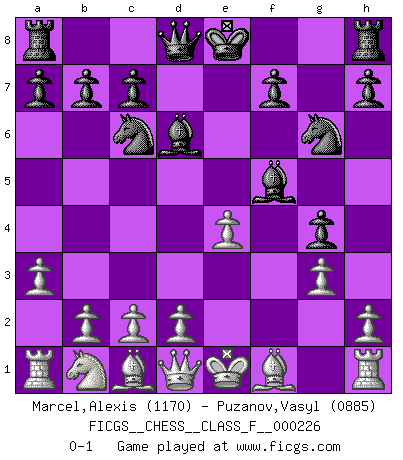 Last move : 0-1 2020 May 5 19:18:40 [Event "FICGS__CHESS__CLASS_F__000226"] [Site "FICGS"] [Date "2020.03.06"] [Round "1"] [White "Marcel,Alexis"] [Black "Puzanov,Vasyl"] [Result "0-1"] [WhiteElo "1170"] [BlackElo "0885"] 1.f4 e5 2.fxe5 d6 3.exd6 Bxd6 4.Nf3 g5 5.g3 g4 6.Nh4 Ne7 7.e4 Nbc6 8.a3 Ng6 9.Nf5 Bxf5 0-1 This chess game has been lost on time (started : 2020.03.06 15:54:50) Bird : From gambit, Lasker variation Player Black won this chess game. Follow this game move after move (download)If Chess is a science, it's a most inexact one. If Chess is an art, it is too exacting to be seen as one. If Chess is a sport, it's too esoteric. If Chess is a game, it's too demanding to be just a game. If Chess is a mistress, she's a demanding one. If Chess is a passion, it's a rewarding one. If Chess is life, it's a sad one. (Unknown) Du musst Deinen Gegner in einen tiefen dunklen Wald führen wo 2+2=5 ist und wo der Weg, der wieder hinausführt, nur breit genug für einen ist. (Mikhail Nekhemyevich Tal) Con el fin de mejorar tu juego, debes de estudiar los finales antes que todo, ya que mientras que los finales pueden ser estudiados y dominados por sí mismos, el juegomedio y la apertura deben de ser estudiados en relación con los finales. (José Raúl Capablanca) Une platitude souvent récitée à propos des Echecs est qu'une des choses les plus difficiles à réaliser est de gagner une position gagnante. Cela ne manque pas de sens mais, pour ma part, j'ai toujours trouvé plus difficile de gagner une position perdante. (Tim Krabbe) Heh, heh, heh. Time to abandon ship. (General Grievous in Star Wars ep.3)