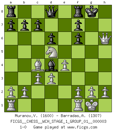 Last move : 1-0 2007 August 31 21:56:1 [Event "FICGS__CHESS__WCH_STAGE_1_GROUP_01__000003"] [Site "FICGS"] [Date "2007.07.11"] [Round "1"] [White "Muranov,Vitaly"] [Black "Barradas,Anderson"] [Result "1-0"] [WhiteElo "1600"] [BlackElo "1307"] 1.e4 e5 2.Nf3 Nf6 3.Nc3 Nc6 4.Bc4 Bb4 5.d3 O-O 6.O-O Bc5 7.Bg5 h6 8.Bh4 Ne7 9.Nxe5 d6 10.Bxf6 gxf6 11.Ng4 Bxg4 12.Qxg4+ Ng6 13.Qxg6+ Kh8 14.Qxh6+ Kg8 15.Nd5 Bd4 16.c3 1-0 Petrov Three knights game Kingside Castling by player Black (move 5) Kingside Castling by player White (move 6) Player White won this chess game. Follow this game move after move (download)Fischer is under obligation to nobody. (Joseph Platz) Ein bischen Romantik kann weder im Schach noch in der Liebe schaden. Also versuche ich mich ab und zu daran zu erinnern. (Nigel Short) Alekhine es un poeta que crea un trabajo de arte de algo que raramente inspiraría a otra persona a mandar una tarjeta postal. (Max Euwe) Si je n'étais pas joueur d'échecs, je serais le meilleur dans quelque chose d'autre. (Anatoli Karpov) Perseverance does not equal worthiness. Next time you want to get my attention, wear something fun. Low-riding jeans are hot. (Gregory House, House M.D.)