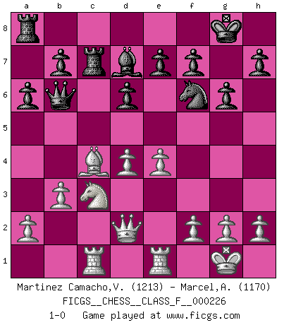 Last move : 1-0 2020 May 23 0:12:43 [Event "FICGS__CHESS__CLASS_F__000226"] [Site "FICGS"] [Date "2020.03.06"] [Round "1"] [White "Martinez Camacho,Victor Hugo"] [Black "Marcel,Alexis"] [Result "1-0"] [WhiteElo "1213"] [BlackElo "1170"] 1.e4 g6 2.d4 Bg7 3.Nf3 c5 4.c3 cxd4 5.Nxd4 Nc6 6.Be3 Nxd4 7.Bxd4 Bxd4 8.cxd4 Qb6 9.Qd2 d6 10.Nc3 Nf6 11.Bd3 O-O 12.Bc4 Bd7 13.O-O a6 14.Rfe1 Rfc8 15.b3 Rc7 16.Rac1 1-0 Robatsch (Modern) defense Kingside Castling by player Black (move 11) Kingside Castling by player White (move 13) Player White won this chess game. Follow this game move after move (download)Fischer is the strongest player in the world. In fact, the strongest player who ever lived. (Larry Evans) Sie führen leise Selbstgespräche, schlürfen lautstark ihre Getränke, schmatzen hörbar beim Essen, blasen ihrem Gegenüber Rauch in die Augen, niesen ihm ins Gesicht, starren ihn unverwandt an, bis er sich unter ihren Blicken windet, rutschen ständig auf ihrem Stuhl hin und her, rülpsen und bohren in der Nase. (Anonymous) La partida mas dura de ganar es una partida ganada. (Emanuel Lasker) Les Echecs sont et restent toujours un combat, un combat intégral comme la boxe, la lutte ou un autre sport, et où il doit y avoir un vainqueur et un vaincu. (Joseph Emil Diemer) To steal ideas from one person is plagiarism. To steal from many is research. (Unknown)