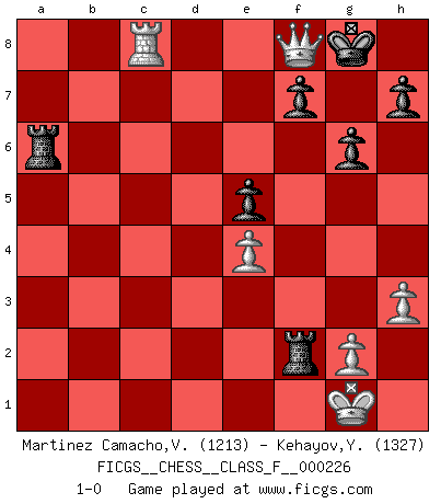 Last move : 1-0 2020 April 6 13:46:28 [Event "FICGS__CHESS__CLASS_F__000226"] [Site "FICGS"] [Date "2020.03.06"] [Round "1"] [White "Martinez Camacho,Victor Hugo"] [Black "Kehayov,Yulian"] [Result "1-0"] [WhiteElo "1213"] [BlackElo "1327"] 1.e4 c5 2.Nc3 Nc6 3.Nf3 g6 4.d4 cxd4 5.Nxd4 Bg7 6.Be3 Nf6 7.Bd3 O-O 8.O-O e5 9.Nxc6 dxc6 10.Qd2 Be6 11.Rad1 Ng4 12.h3 Nxe3 13.Qxe3 b6 14.Bc4 Bxc4 15.Rxd8 Raxd8 16.Re1 a6 17.Qxb6 Bb5 18.Nxb5 axb5 19.Qxc6 Rc8 20.Qxb5 Rxc2 21.a4 Rfc8 22.a5 R8c5 23.Qe8+ Bf8 24.a6 Rxb2 25.Rf1 Ra5 26.Rc1 Rxa6 27.Rc8 Rxf2 28.Qxf8+ 1-0 Sicilian : Closed, 2...Nc6 Kingside Castling by player Black (move 7) Kingside Castling by player White (move 8) Player White won this chess game. Follow this game move after move (download)We cannot resist the fascination of sacrifice, since a passion for sacrifices is part of a Chessplayer's nature. (Rudolf Spielman) Viele Opfer benötigen überhaupt keine konkrete Berechnung. Es genügt sich die entstehende Position kurz vorzustellen, um uns davon zu überzeugen, dass das Opfer korrekt ist. (Mikhail Nekhemyevich Tal) Mi estilo es algo parecido entre un poco de Tal y Petrosian. (Reshevsky) À la honte des hommes, on sait que les lois du jeu sont les seules qui soient partout justes, claires, inviolables et exécutées. Pourquoi l'Indien qui a donné les règles du jeu d'échecs est-il obéi de bon gré dans toute la terre, et que les décrétales des papes, par exemple, sont aujourd'hui un objet d'horreur et de mépris ? C'est que l'inventeur des échecs combina tout avec justesse pour la satisfaction des joueurs, et que les papes, dans leurs décrétales, n'eurent en vue que leur seul avantage. L'Indien voulut exercer également l'esprit des hommes et leur donner du plaisir; les papes ont voulu abrutir l'esprit des hommes. Voltaire (Dictionnaire philosophique / Garnier 1967) There are two types of people in this world, good and bad. The good sleep better, but the bad seem to enjoy the waking hours much more. (Woody Allen)