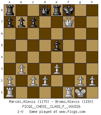 Last move : 1-0 2020 March 16 12:17:16 [Event "FICGS__CHESS__CLASS_F__000226"] [Site "FICGS"] [Date "2020.03.06"] [Round "1"] [White "Marcel,Alexis"] [Black "Bromo,Alexis"] [Result "1-0"] [WhiteElo "1170"] [BlackElo "1150"] 1.f4 d5 2.Nf3 Nc6 3.e3 Bg4 4.Be2 Bxf3 5.Bxf3 e5 6.fxe5 Nxe5 7.O-O Nf6 8.b3 Bd6 9.Bb2 O-O 10.Nc3 Nxf3+ 11.Qxf3 Re8 12.Nxd5 Re6 13.Nxf6+ gxf6 14.Qg4+ Kf8 15.Qh4 Be5 16.Bxe5 fxe5 17.Qxh7 Re8 18.Qxf7+ 1-0 Bird's Opening Kingside Castling by player White (move 7) Kingside Castling by player Black (move 9) Player White won this chess game. Follow this game move after move (download)In Chess, as it is played by masters, chance is practically eliminated. (Emanuel Lasker) Die Elozahlen sind sehr schlecht für das Schach. Jetzt ist Schach eine Sportindustrie, die darauf zielt Elopunkte zu machen. (Miguel Najdorf) No soy una persona materialista y por eso, no resiento la falta o pérdida del dinero. La ausencia de cosas mundanas carece de importancia. Ya que el Ajedrez es una forma en la que puedo ser tan materialista como yo desee sin tener la necesidad de vender mi alma. (Jamie Walter Adams) On n'a jamais que l'âge auquel on a commence à jouer aux échecs car après on cesse de vieillir. (Capablanca) The Internet is so big, so powerful and pointless that for some people it is a complete substitute for life. (Andrew Brown)