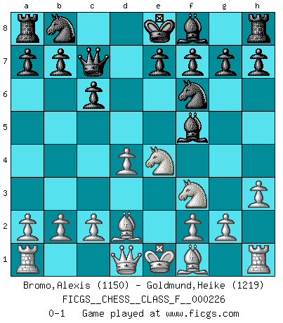 Last move : 0-1 2020 April 24 22:51:28 [Event "FICGS__CHESS__CLASS_F__000226"] [Site "FICGS"] [Date "2020.03.06"] [Round "1"] [White "Bromo,Alexis"] [Black "Goldmund,Heike"] [Result "0-1"] [WhiteElo "1150"] [BlackElo "1219"] 1.e4 d5 2.exd5 Qxd5 3.Nc3 Qa5 4.d4 Nf6 5.Nf3 Bg4 6.h3 Bf5 7.Bd2 c6 8.Ne4 Qc7 0-1 This chess game has been lost on time (started : 2020.03.06 15:54:50) Scandinavian defense, Lasker variation Player Black won this chess game. Follow this game move after move (download)Chess is a sea in which a gnat may drink and an elephant may bathe. (Hindu proverb) Ich möchte Schüler heranbilden, die das Vermögen haben, selbst zu denken und Kritik zu üben. (Emanuel Lasker) Personalmente, yo prefiero mirar hacia el futuro en donde un programa de computadora gane el título mundial de Ajedrez. La humanidad necesita una lección de humildad. (Richard Dawkings) Mais l'homme est une créature légère et illogique : semblable au joueur d'échecs, il n'aime que le processus du but à atteindre, non le but lui-même. (Dostoïevsky) He who defends everything defends nothing. (Frederick the Great)