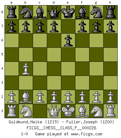 Last move : 1-0 2020 April 18 16:39:19 [Event "FICGS__CHESS__CLASS_F__000226"] [Site "FICGS"] [Date "2020.03.06"] [Round "1"] [White "Goldmund,Heike"] [Black "Fuller,Joseph"] [Result "1-0"] [WhiteElo "1219"] [BlackElo "1200"] 1.b4 e6 2.Bb2 1-0 This chess game has been lost on time (started : 2020.03.06 15:54:50) Polish (Sokolsky) opening Player White won this chess game. Follow this game move after move (download)I have never in my life played the French Defence, which is the dullest of all openings. (Wilhelm Steinitz) Obwohl ich vom Stil her kaum zu den Priestern der Schachkunst gezählt werde, halte ich Schach doch für eine Kunst. (Tigran Petrosjan) Nunca nadie ha ganado una partida de Ajedrez rindiendose. (Unknown) J'ai vu le vaincu d'Echecs jouer des années durant dans l'espoir de la fête de la victoire. Car tu es plus riche de ce qu'elle existe si même elle n'est point pour toi. Ainsi de la perle du fond des mers. (Antoine de Saint-Exupéry) The mind is like a parachute, it only functions when its open. (Unknown)