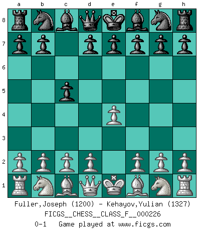 Last move : 0-1 2020 March 8 17:49:13 [Event "FICGS__CHESS__CLASS_F__000226"] [Site "FICGS"] [Date "2020.03.06"] [Round "1"] [White "Fuller,Joseph"] [Black "Kehayov,Yulian"] [Result "0-1"] [WhiteElo "1200"] [BlackElo "1327"] 1.e4 c5 0-1 Sicilian defense Player Black won this chess game. Follow this game move after move (download)Man is a frivolous, a specious creature, and like a Chess player, cares more for the process of attaining his goal than for the goal itself. (Dostoyevsky) Wenn Dein Gegner dir ein Remis anbietet, versuch herauszufinden, weshalb er glaubt schlechter zu stehen. (Nigel Short) Un mal día en el Ajedrez, es mejor que cualquier buen día en el trabajo. (Anonymous) A ce moment-là, je menaçais de comprendre la position ! (Clément L'Heureux) Programming can only do so much before it becomes too much. (Don Groves)