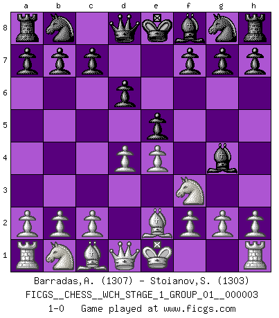 Last move : 1-0 2007 August 14 9:33:11 [Event "FICGS__CHESS__WCH_STAGE_1_GROUP_01__000003"] [Site "FICGS"] [Date "2007.07.11"] [Round "1"] [White "Barradas,Anderson"] [Black "Stoianov,Stoian"] [Result "1-0"] [WhiteElo "1307"] [BlackElo "1303"] 1.e4 e5 2.Nf3 d6 3.d4 Bg4 4.Be2 1-0 This chess game has been lost on time (started : 2007.07.11 16:47:33) Philidor's defense Player White won this chess game. Follow this game move after move (download)Chess is a foolish expedient for making idle people believe they are doing something very clever when they are only wasting their time. (George Bernard Shaw) Der Vorposten provoziert a) eine Basis für neue Angriffe und b) eine Schwächung der gegnerischen Widerstandskraft in der fraglichen Linie. (Aaron Nimzowitsch) Los Peones son el alma de una partida de Ajedrez. (Francois Andre Danican Philidor) On est toujours la mazette de quelqu'un d'autre. (Anonyme) Luck is what you have left over after you give 100 percent. (Langston Coleman)