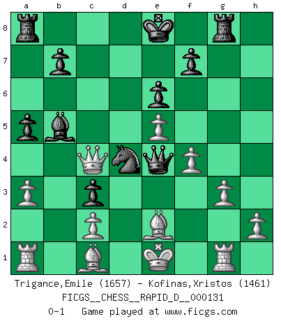 Last move : 0-1 2020 April 6 15:26:39 [Event "FICGS__CHESS__RAPID_D__000131"] [Site "FICGS"] [Date "2020.03.06"] [Round "1"] [White "Trigance,Emile"] [Black "Kofinas,Xristos"] [Result "0-1"] [WhiteElo "1657"] [BlackElo "1461"] 1.e4 e6 2.d4 d5 3.Nc3 Bb4 4.e5 c5 5.a3 Bxc3+ 6.bxc3 Ne7 7.Qg4 Qc7 8.Qxg7 Rg8 9.Qxh7 cxd4 10.Ne2 Nbc6 11.f4 dxc3 12.Qd3 d4 13.Nxd4 Nxd4 14.Qxd4 Bd7 15.g3 Qc6 16.Rg1 Nf5 17.Qb4 a5 18.Qb3 Qe4+ 19.Be2 Nd4 20.Qc4 Bb5 0-1 French : Winawer, Advance, poisoned pawn variation Player Black won this chess game. Follow this game move after move (download)What would Chess be without silly mistakes ? (Kurt Richter) Es hat in meinem Leben Zeiten gegeben, da ich sehr nahe daran war zu glauben, daß ich auch nicht eine einzige Schachpartie verlieren könnte. (José Raúl Capablanca) Morphy probablemente fue el genio más grande de todos. (Bobby Fischer) Le joueur d'Echecs qui veut atteindre le top est obligé de développer son propre credo créatif. Alexeï Stepanovicth Souétine. Il est facile d'écrire des livres ! Ce qui est difficile, c'est de jouer ! (Alexeï Stepanovicth Souétine) Dave, my mind is going. I can feel it. (HAL 9000 in 2001, a space odyssey)